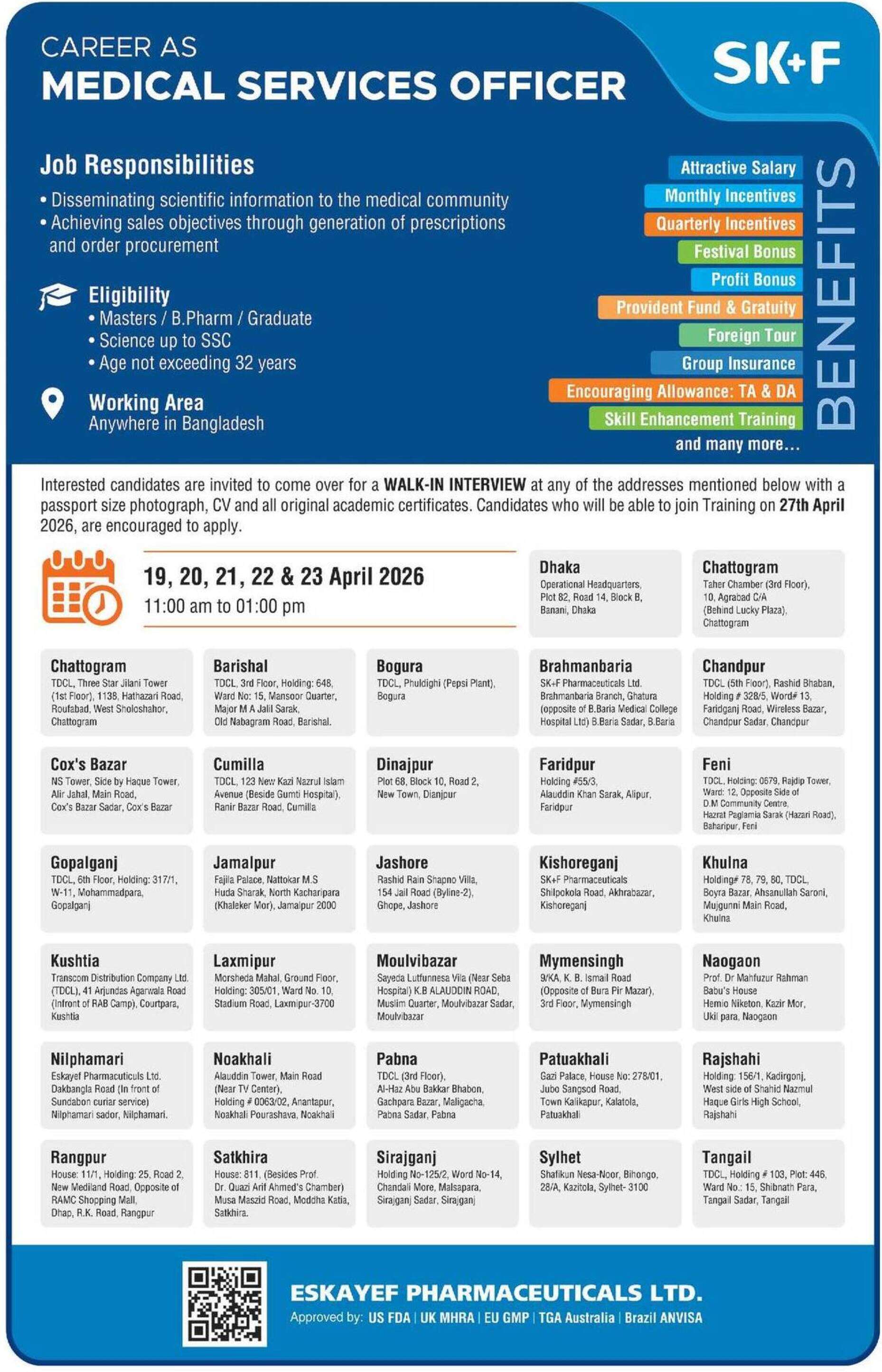 সরাসরি সাক্ষাৎকারে এসকেএফ ফার্মাসিউটিক্যালস লিমিটেড-এ ক্যারিয়ার গড়ার সুবর্ণ সুযোগ