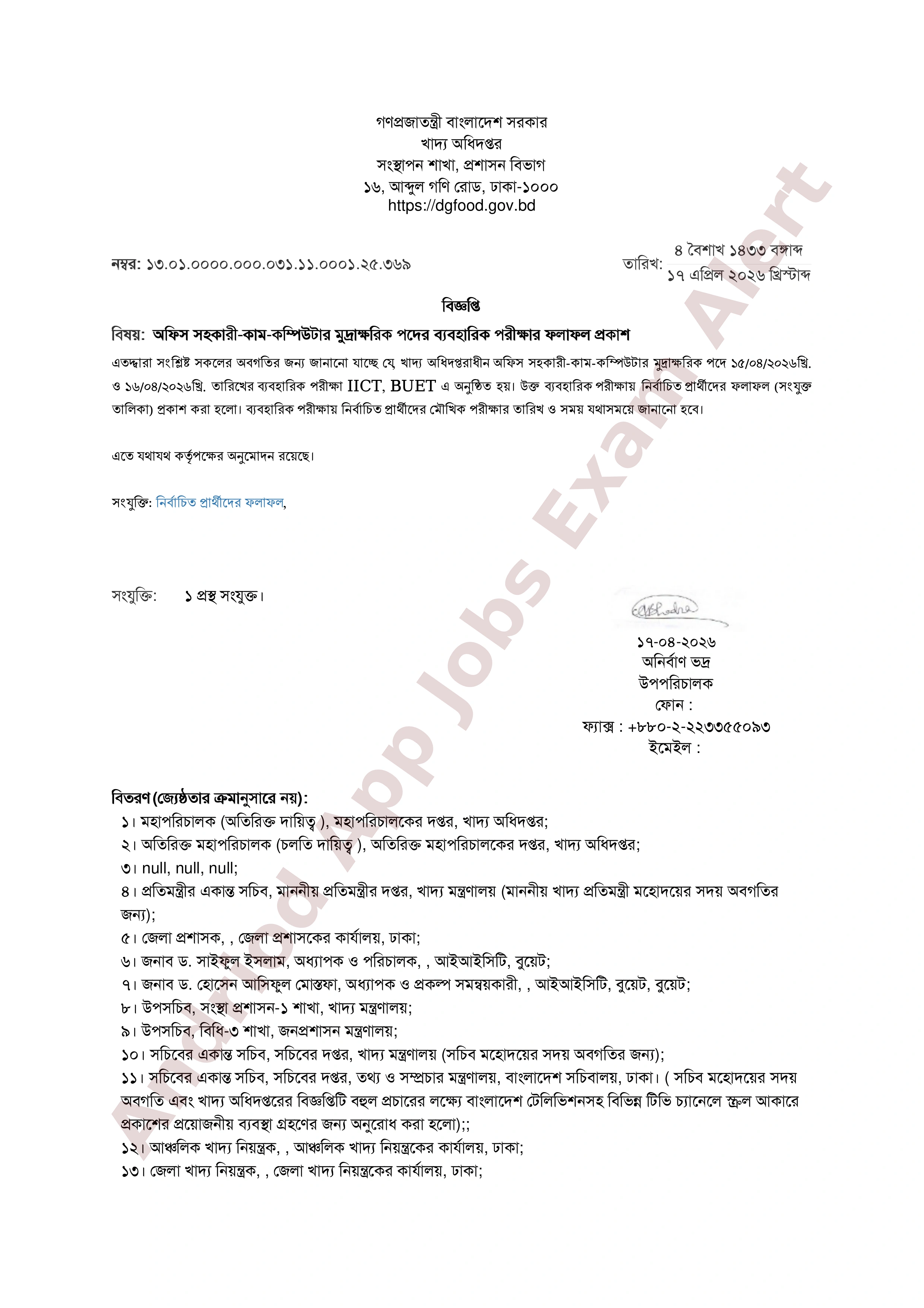 খাদ্য অধিদপ্তরাধীন অফিস সহকারী-কাম-কম্পিউটার মুদ্রাক্ষরিক পদের ব্যবহারিক পরীক্ষার ফলাফল প্রকাশিত হয়েছে। গত ১৫/০৪/২০২৬ এবং ১৬/০৪/২০২৬ তারিখে অনুষ্ঠিত এই পরীক্ষায় অংশগ্রহণকারী প্রার্থীদের মধ্যে যারা উত্তীর্ণ হয়েছেন, তাদের তালিকা প্রকাশ করেছে খাদ্য অধিদপ্তর।