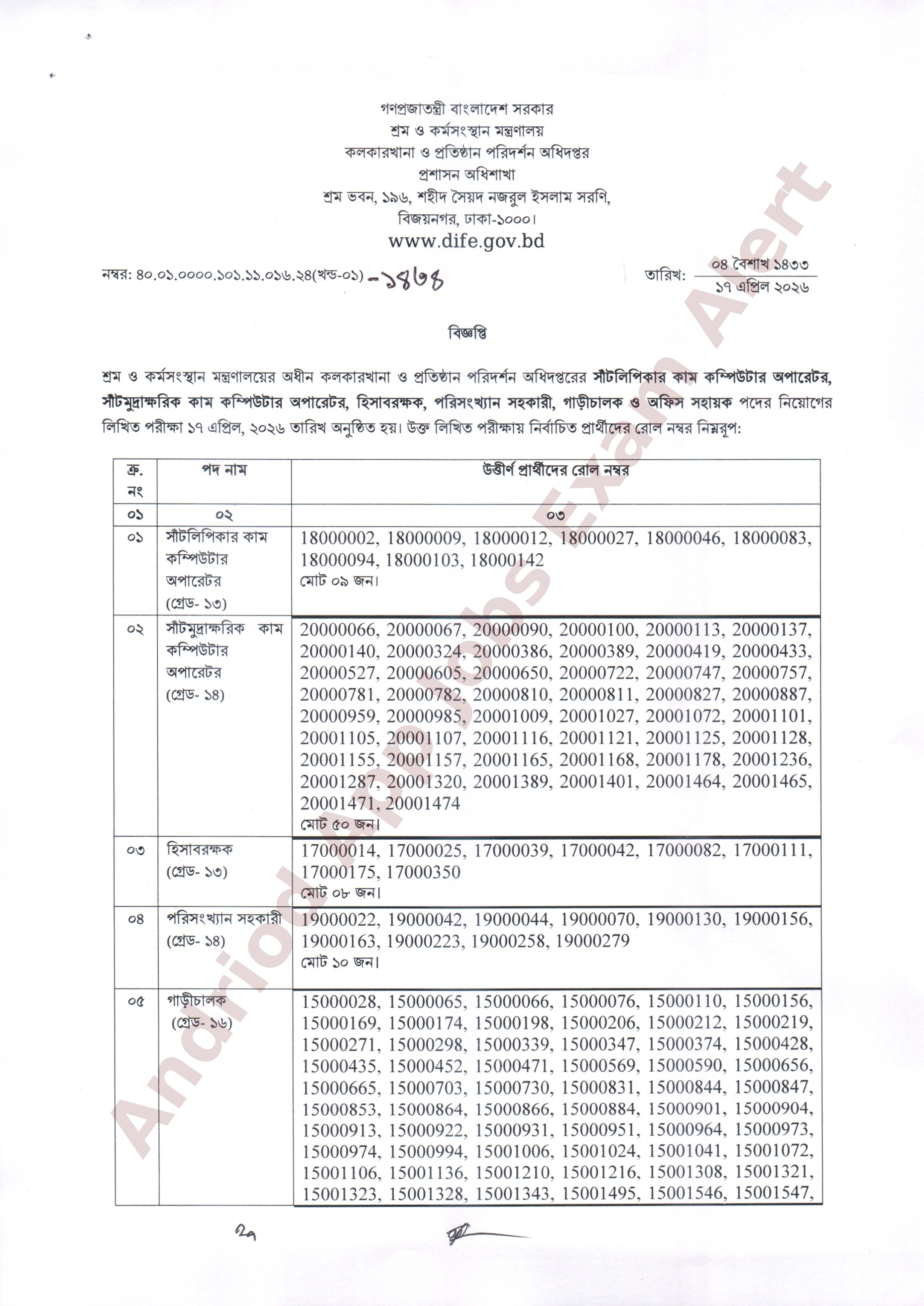 শ্রম ও কর্মসংস্থান মন্ত্রণালয়ের অধীন কলকারখানা ও প্রতিষ্ঠান পরিদর্শন অধিদপ্তরের রাজস্ব খাতভুক্ত বিভিন্ন পদের লিখিত পরীক্ষার ফলাফল প্রকাশ করা হয়েছে। গত ১৭ এপ্রিল ২০২৬ তারিখে অনুষ্ঠিত লিখিত পরীক্ষায় উত্তীর্ণ প্রার্থীদের রোল নম্বরসমূহ অধিদপ্তরের পক্ষ থেকে বিজ্ঞপ্তির মাধ্যমে জানানো হয়েছে।