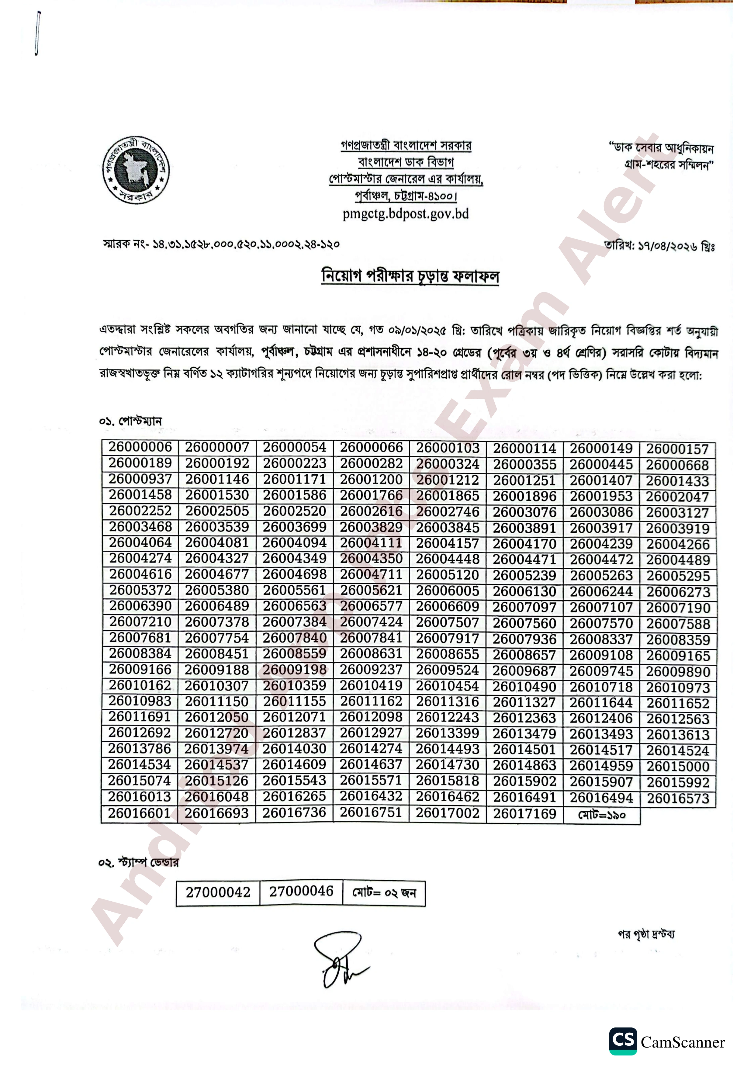 বাংলাদেশ ডাক বিভাগের পোস্টমাস্টার জেনারেলের কার্যালয়, পূর্বাঞ্চল, চট্টগ্রাম-এর বিভিন্ন শূন্যপদে নিয়োগের জন্য অনুষ্ঠিত পরীক্ষার চূড়ান্ত ফলাফল প্রকাশিত হয়েছে। গত ০৯/০১/২০২৫ তারিখে জারিকৃত নিয়োগ বিজ্ঞপ্তির শর্ত অনুযায়ী ১৪-২০ গ্রেডের ১২টি ক্যাটাগরির পদের জন্য প্রার্থীদের চূড়ান্তভাবে সুপারিশ করা হয়েছে।