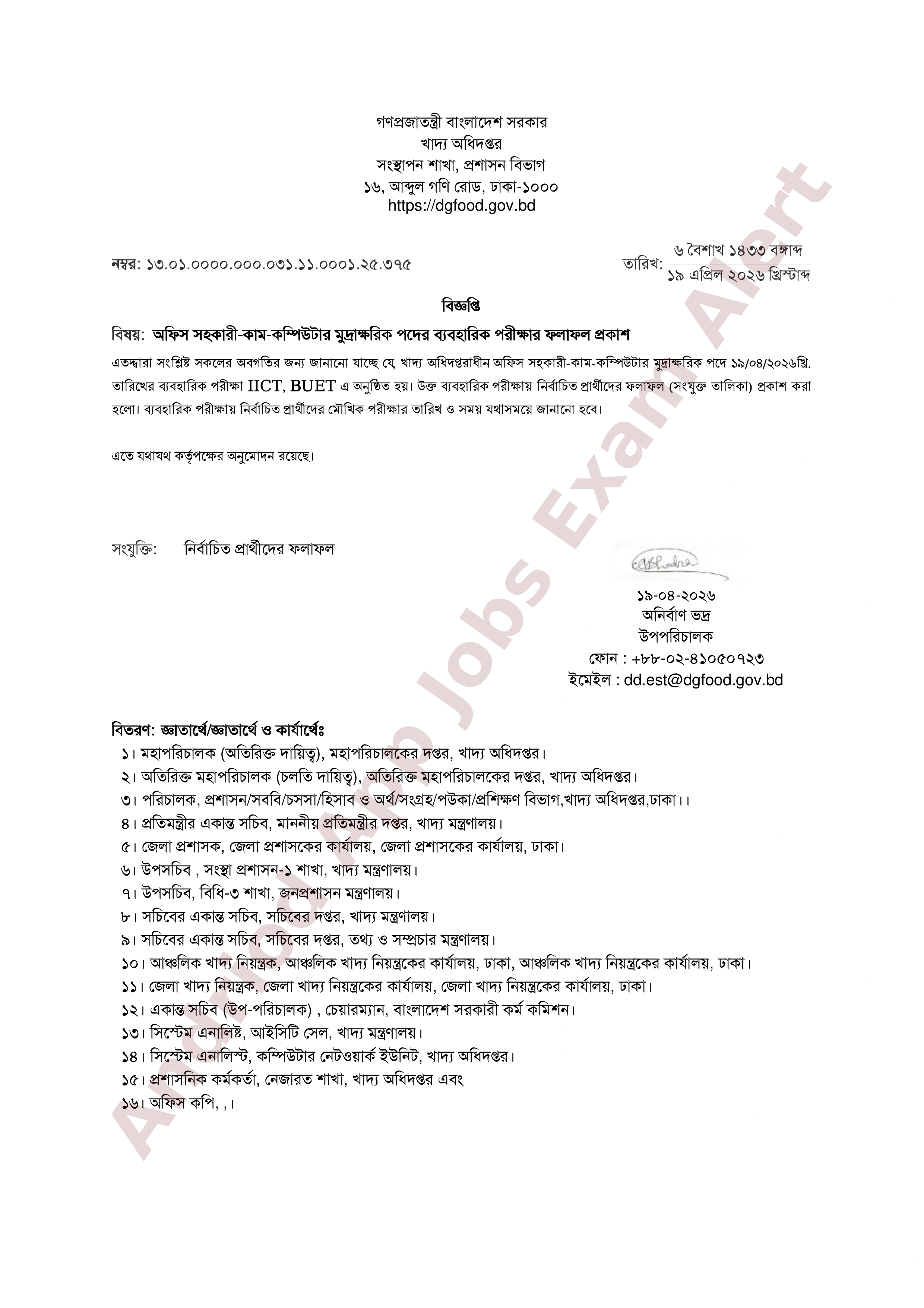 গণপ্রজাতন্ত্রী বাংলাদেশ সরকারের খাদ্য অধিদপ্তরাধীন একটি পদের ব্যবহারিক পরীক্ষার ফলাফল প্রকাশিত হয়েছে। ১৯ এপ্রিল ২০২৬ তারিখে অনুষ্ঠিত এই পরীক্ষায় উত্তীর্ণ প্রার্থীদের তালিকা প্রকাশ করেছে খাদ্য অধিদপ্তর কর্তৃপক্ষ।