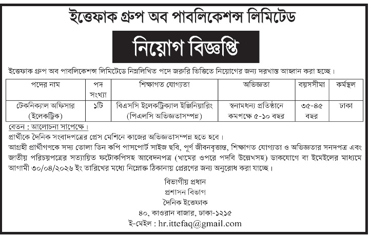 ইত্তেফাক গ্রুপ অফ পাবলিকেশন্স লিমিটেড (ittefaq job circular 2026) তাদের টেকনিক্যাল বিভাগে দক্ষ জনবল নিয়োগের লক্ষ্যে নতুন নিয়োগ বিজ্ঞপ্তি প্রকাশ করেছে। আপনি যদি অভিজ্ঞ ইলেকট্রিক্যাল ইঞ্জিনিয়ার হয়ে থাকেন, তবে দ্রুত আবেদন করুন।