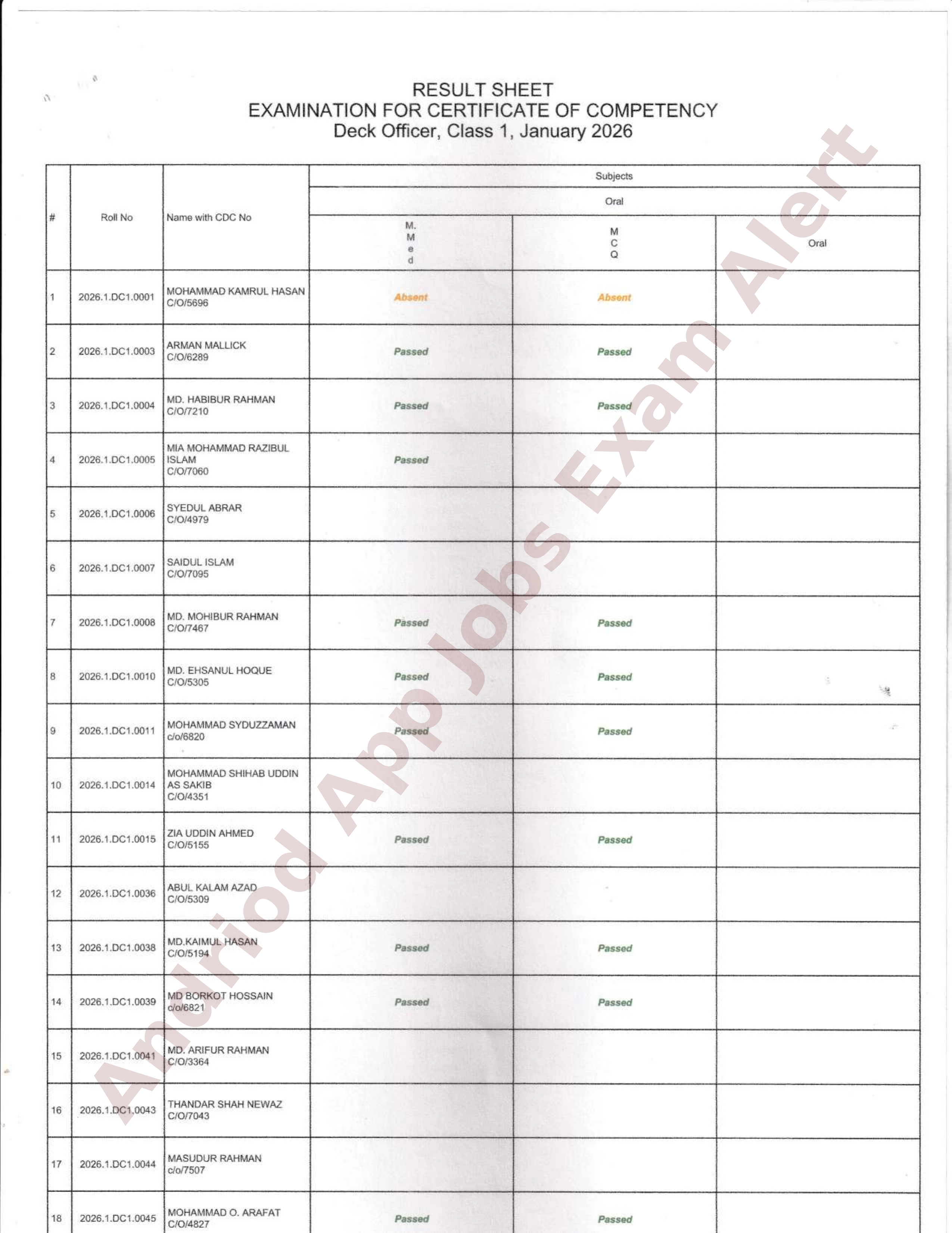 নৌপরিবহন অধিদপ্তর কর্তৃক পরিচালিত ডেক অফিসার এবং ফিশিং ভেসেল স্কিপার সার্টিফিকেট অফ কম্পিটেন্সি (COC) পরীক্ষার ফলাফল প্রকাশিত হয়েছে। জানুয়ারি ২০২৬ সেশনের এই ফলাফল শিটে উত্তীর্ণ প্রার্থীদের তালিকা প্রকাশ করা হয়েছে।