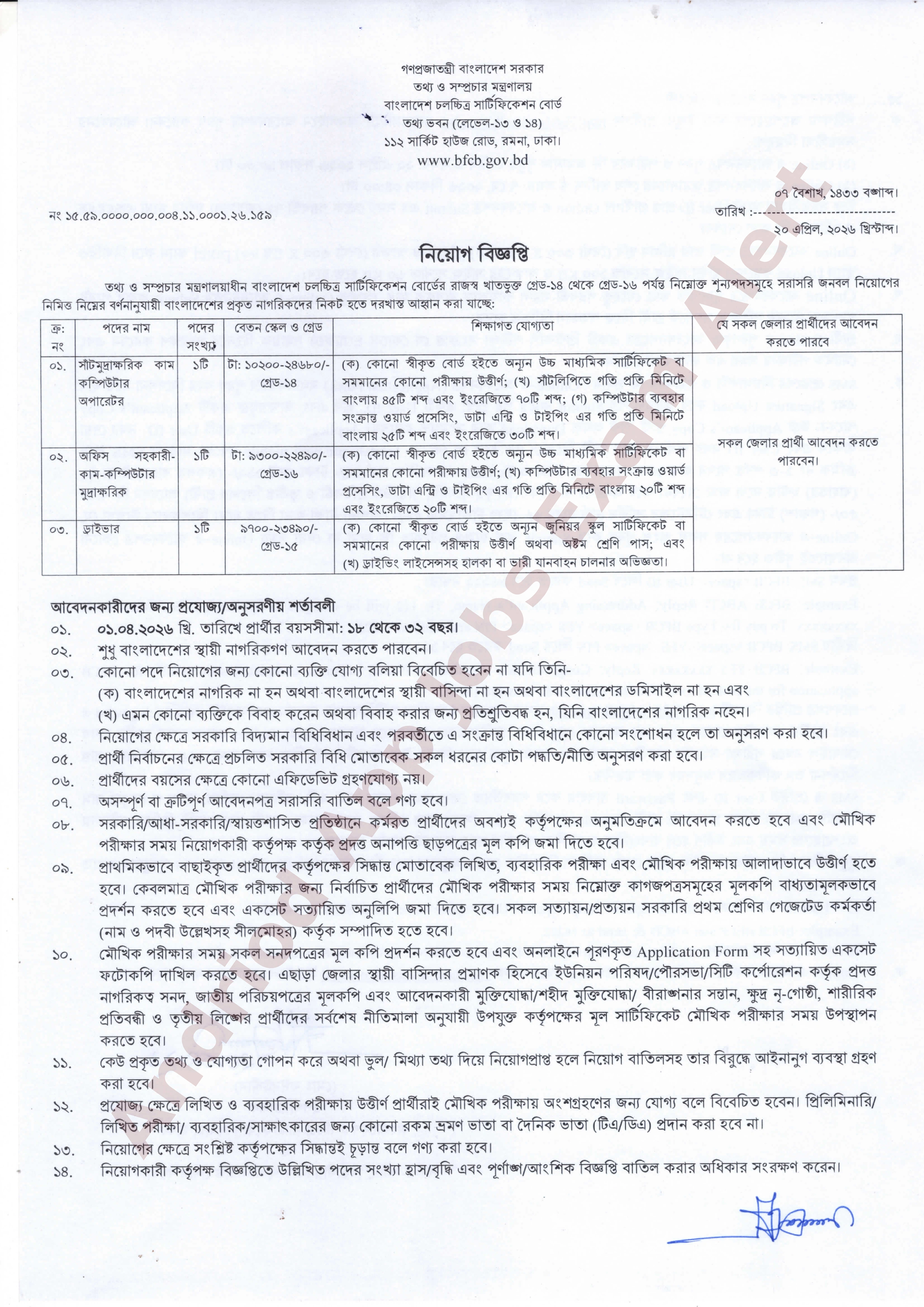 তথ্য ও সম্প্রচার মন্ত্রণালয়ের আওতাধীন বাংলাদেশ চলচ্চিত্র সার্টিফকেশন বোর্ডের রাজস্ব খাতভুক্ত শূন্যপদসমূহে সরাসরি জনবল নিয়োগের বিজ্ঞপ্তি প্রকাশিত হয়েছে। আগ্রহী যোগ্য প্রার্থীরা নির্ধারিত সময়ের মধ্যে অনলাইনে আবেদন করতে পারবেন।