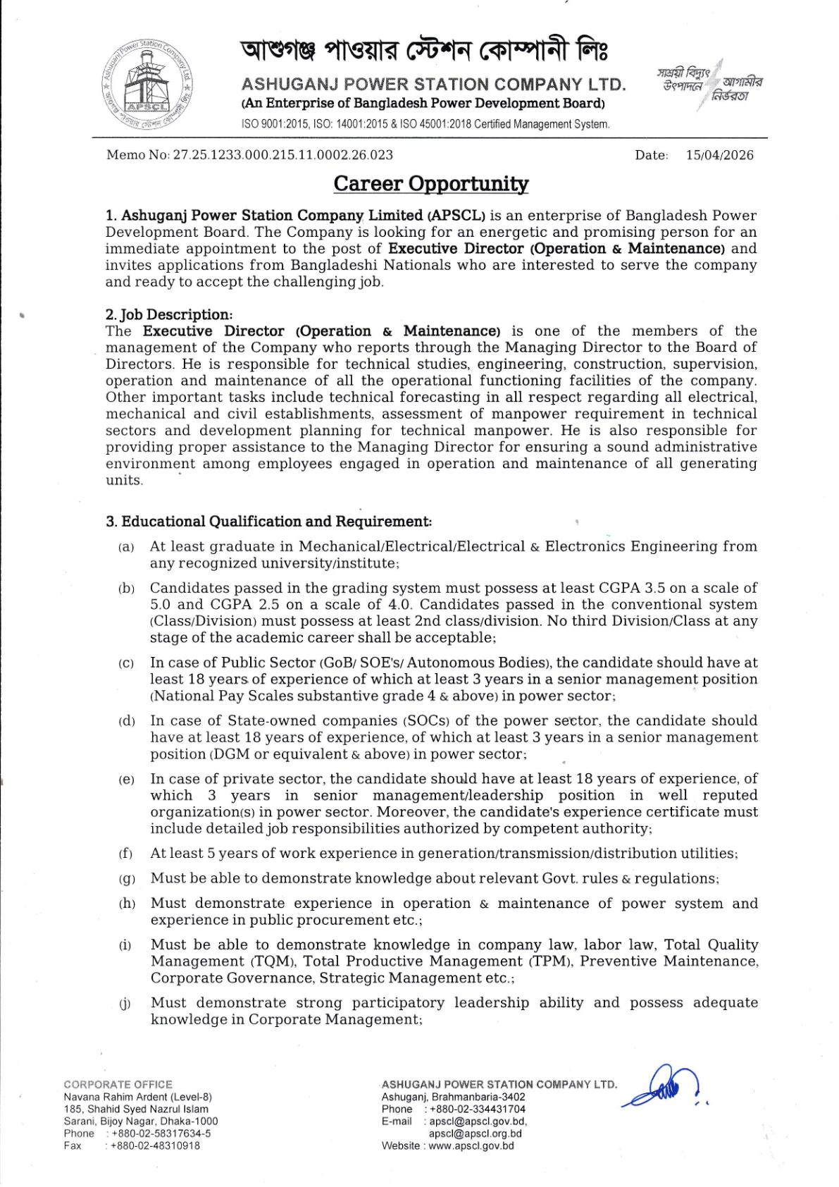 আপনি কি বিদ্যুৎ খাতে একটি উচ্চপদস্থ এবং সম্মানজনক ক্যারিয়ার খুঁজছেন? আশুগঞ্জ পাওয়ার স্টেশন কোম্পানি লিমিটেড (APSCL) (APSCL_Job_Circular_2026) Ashuganj_Power_Station_Job তাদের 'এক্সিকিউটিভ ডিরেক্টর' পদে জনবল নিয়োগের জন্য বিশাল এক নিয়োগ বিজ্ঞপ্তি প্রকাশ করেছে। আকর্ষণীয় বেতন ও অন্যান্য সুযোগ-সুবিধাসহ এই চাকরিতে আবেদনের বিস্তারিত তথ্য নিচে দেওয়া হলো।