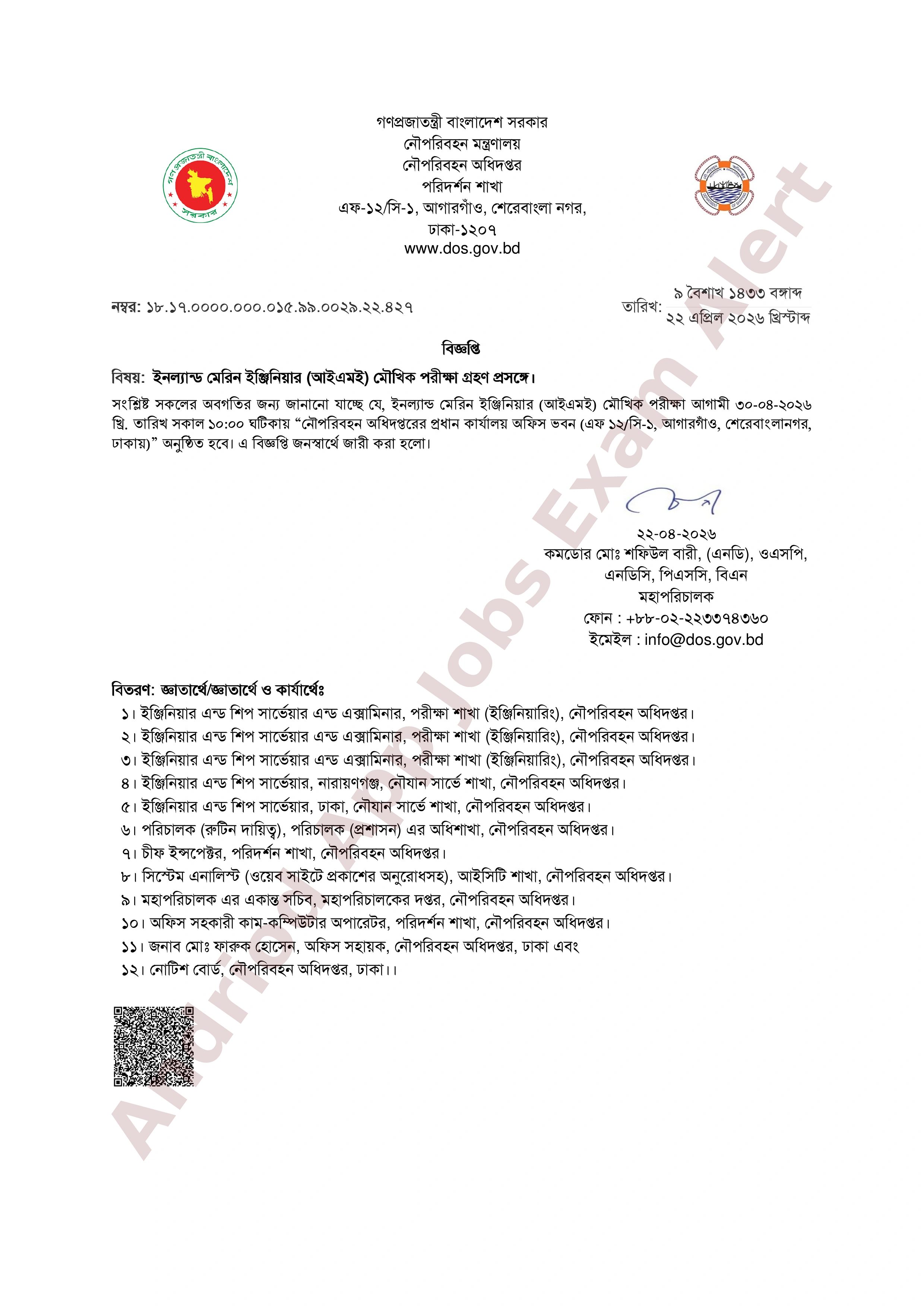 পরীক্ষার স্থান: নৌপরিবহন অধিদপ্তরের প্রধান কার্যালয় অফিস ভবন (এফ ১২/সি-১, আগারগাও, শেরেবাংলানগর, ঢাকা-১২০৭)।