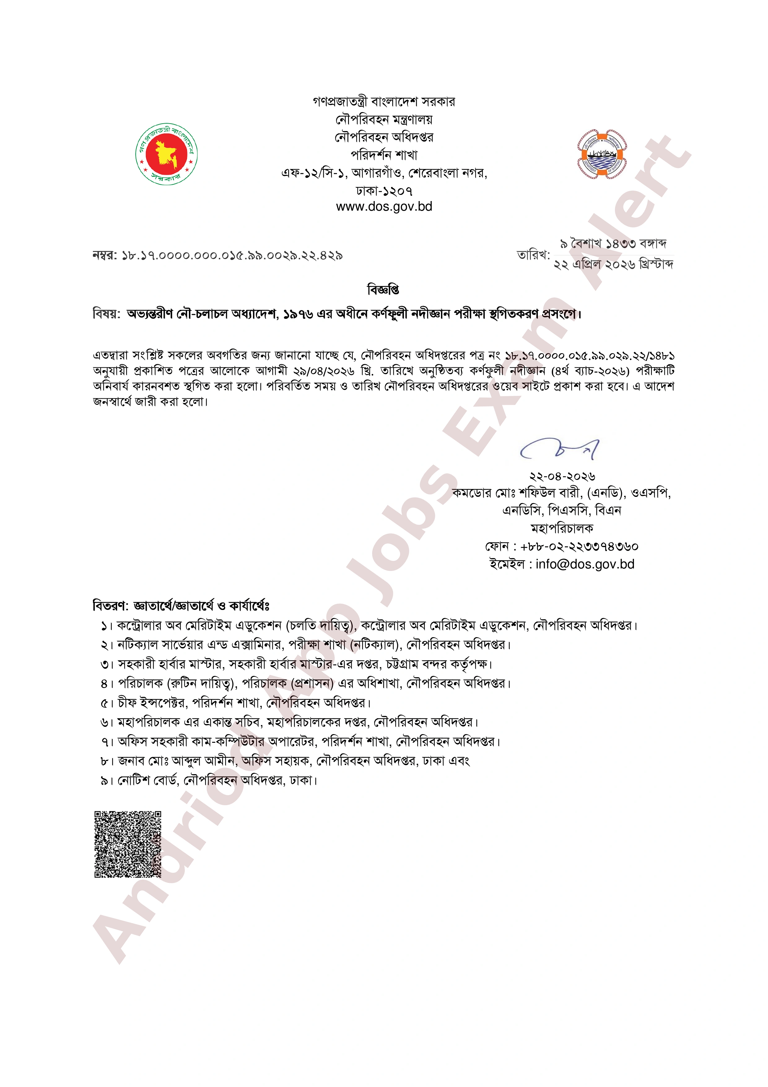 স্থগিত হওয়া পরীক্ষার পরিবর্তিত সময় ও তারিখ পরবর্তীতে নৌপরিবহন অধিদপ্তরের অফিসিয়াল ওয়েবসাইট (www.dos.gov.bd) এর মাধ্যমে জানিয়ে দেওয়া হবে। জনস্বার্থে এই আদেশ জারি করা হয়েছে।
