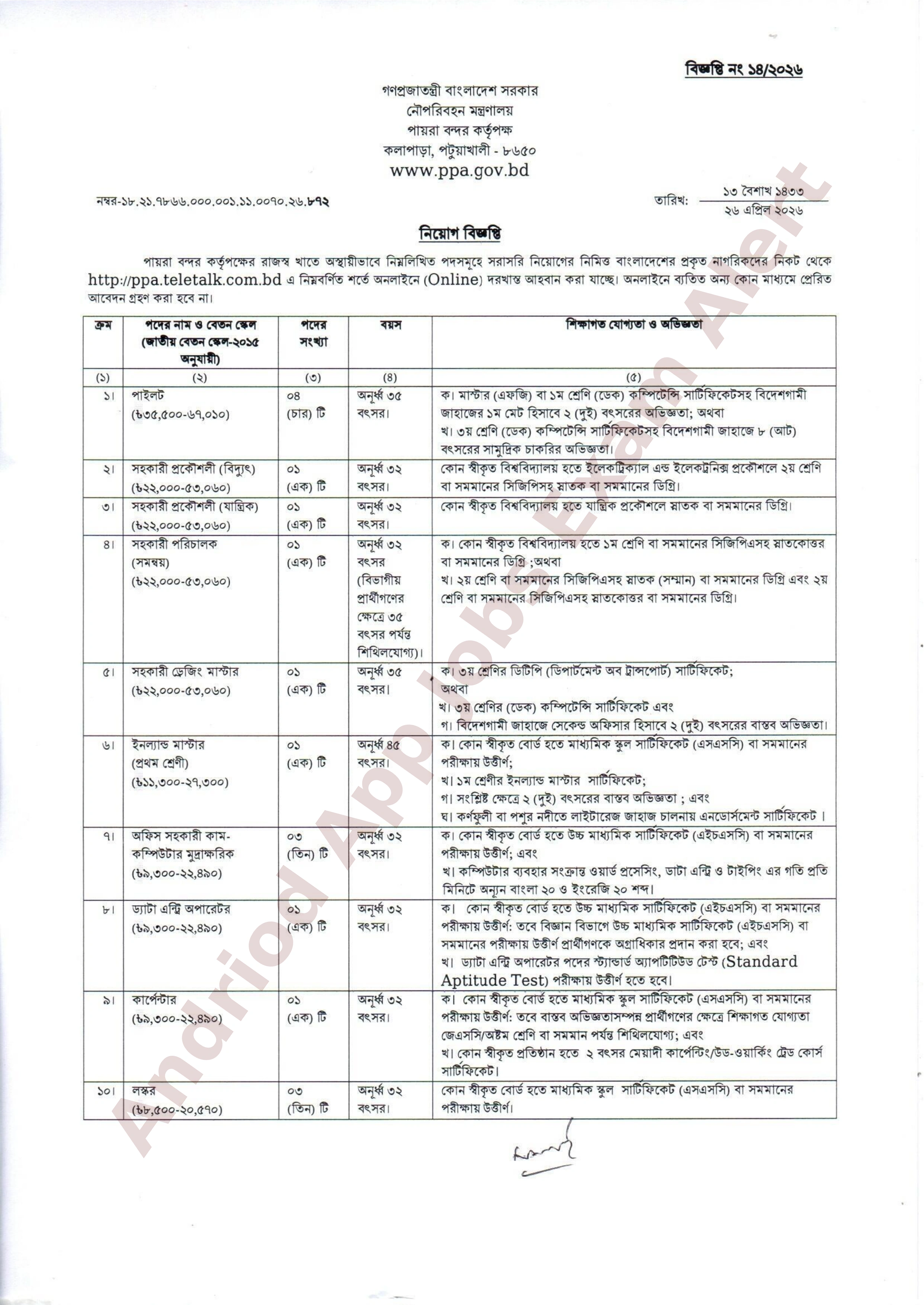 পায়রা বন্দর কর্তৃপক্ষের রাজস্ব খাতে অস্থায়ীভাবে জনবল নিয়োগের জন্য একটি নতুন নিয়োগ বিজ্ঞপ্তি প্রকাশিত হয়েছে। বাংলাদেশের প্রকৃত নাগরিকদের নিকট থেকে পদগুলোর জন্য অনলাইনে আবেদন আহ্বান করা যাচ্ছে।