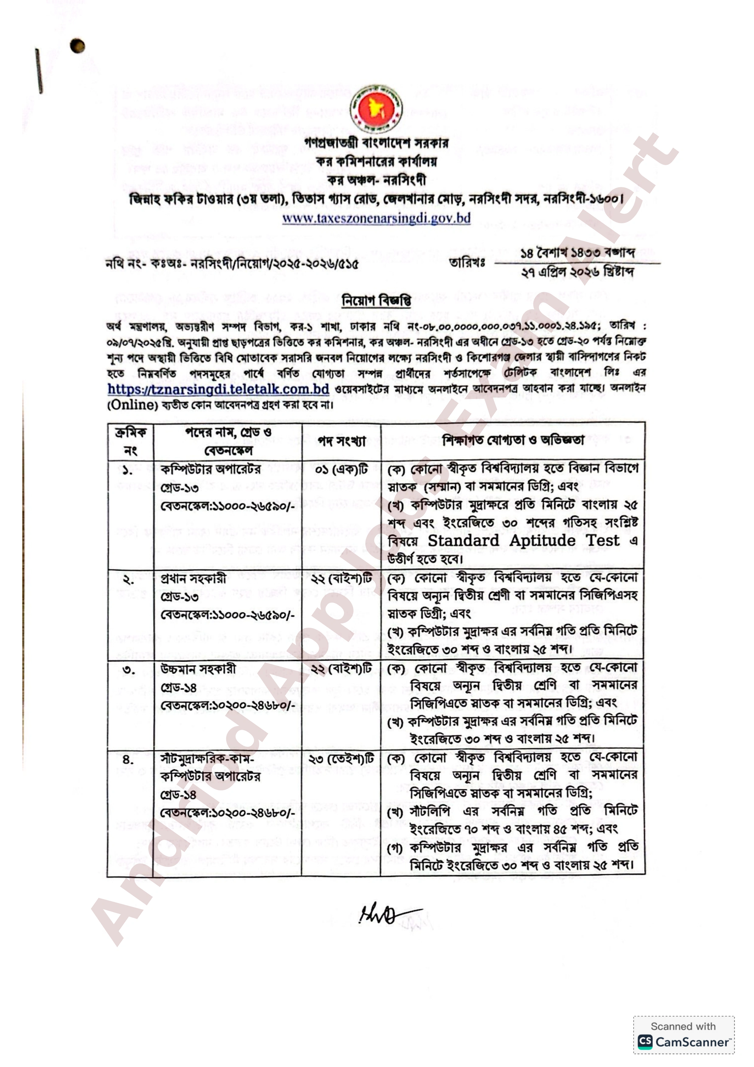 গণপ্রজাতন্ত্রী বাংলাদেশ সরকার, কর কমিশনারের কার্যালয়, কর অঞ্চল-নরসিংদী এর অধীনে ১৩তম গ্রেড হতে ২০তম গ্রেড পর্যন্ত বিভিন্ন শূন্য পদে জনবল নিয়োগের জন্য বিজ্ঞপ্তি প্রকাশ করা হয়েছে। উক্ত নিয়োগে নরসিংদী ও কিশোরগঞ্জ জেলার স্থায়ী বাসিন্দারা আবেদন করতে পারবেন।
