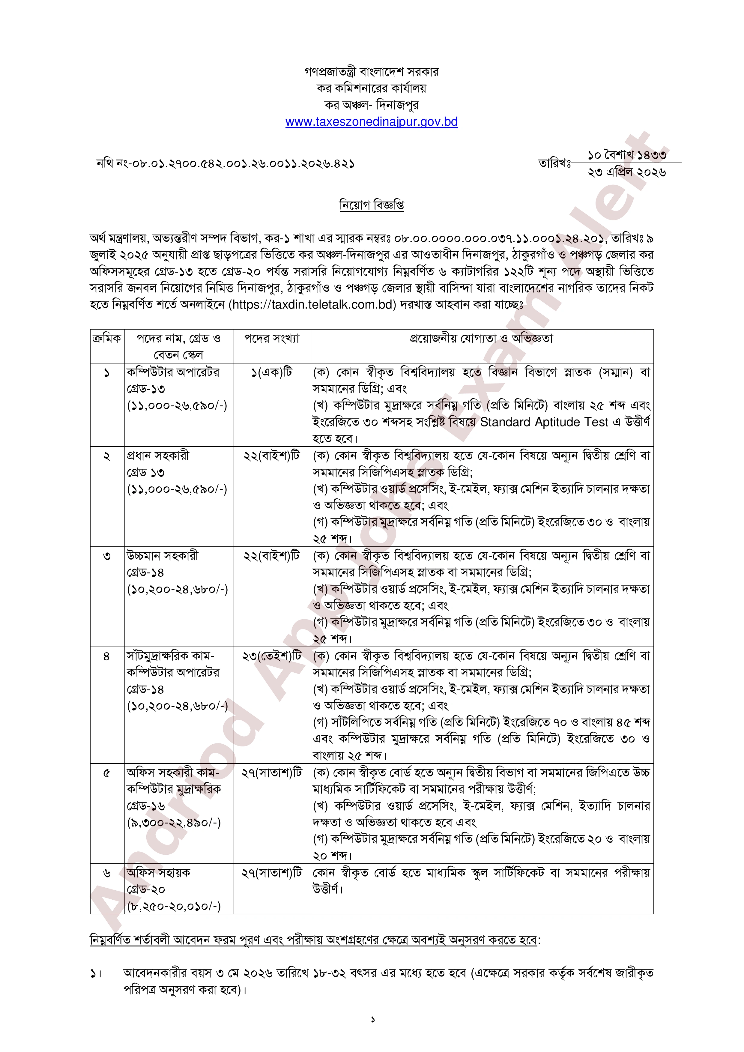 পরীক্ষার তথ্য: লিখিত, ব্যবহারিক ও মৌখিক পরীক্ষার তারিখ ও সময় পরবর্তীতে কর অঞ্চল-দিনাজপুরের ওয়েবসাইট এবং প্রার্থীর মোবাইল ফোনে এসএমএস-এর মাধ্যমে জানানো হবে।