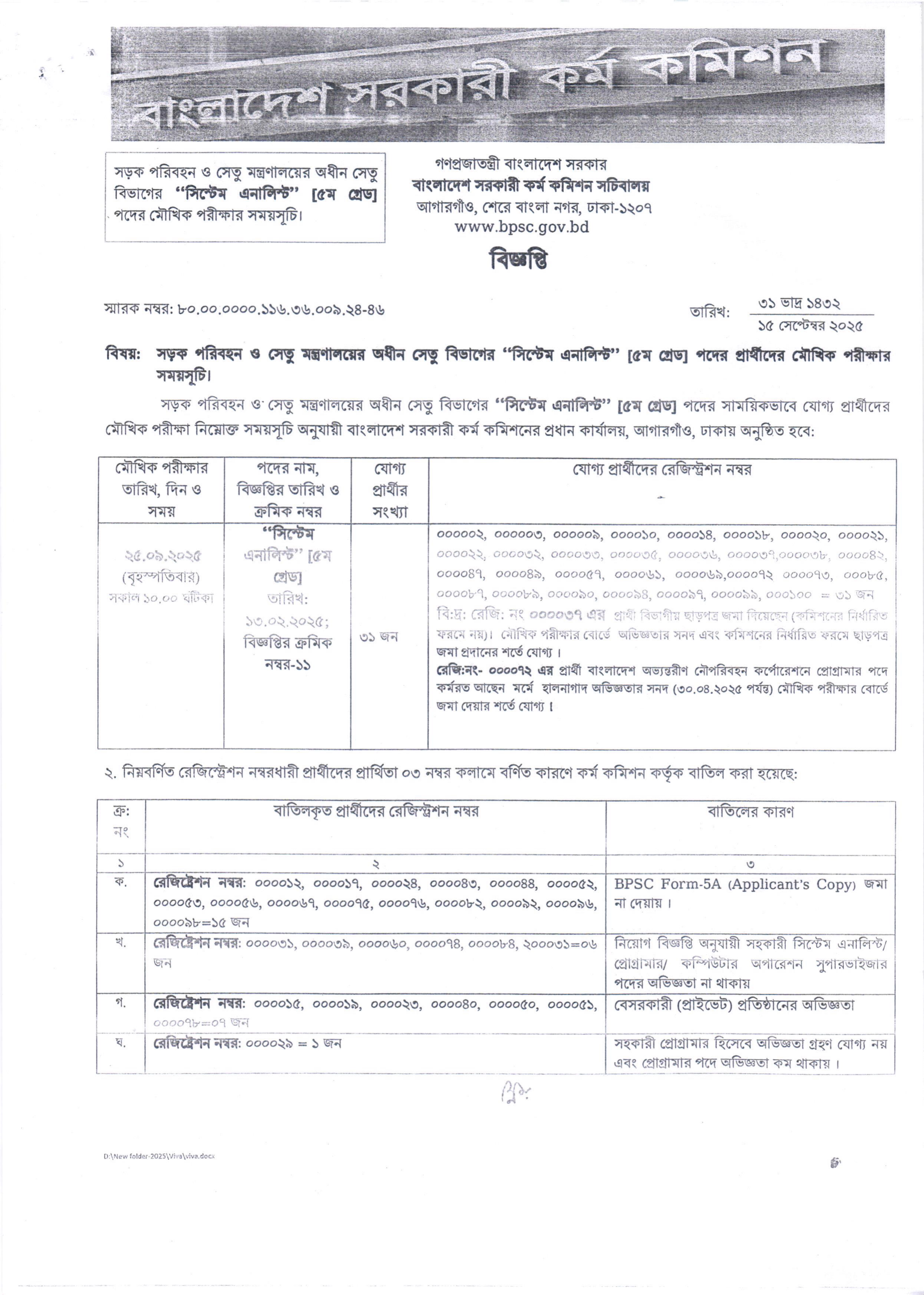 সড়ক পরিবহন ও সেতু মন্ত্রণালয়ের অধীন সেতু বিভাগের “সিস্টেম এনালিস্ট” (৫ম গ্রেড) পদের প্রার্থীদের মৌখিক পরীক্ষার সময়সূচি প্রকাশ করেছে বাংলাদেশ সরকারী কর্ম কমিশন।