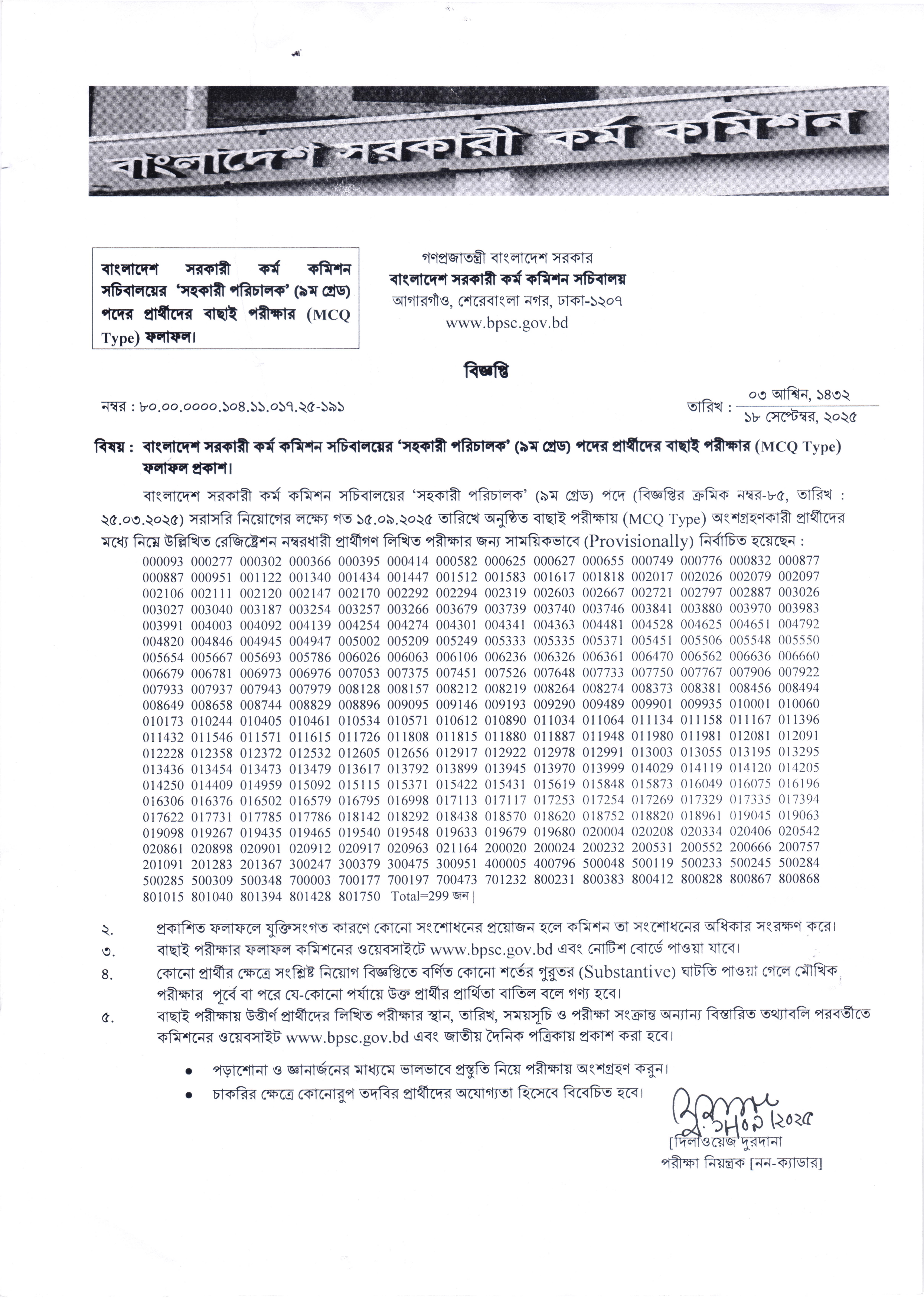 বাংলাদেশ সরকারী কর্ম কমিশন সচিবালয়ের “সহকারী পরিচালক” (৯ম গ্রেড) পদের জন্য গত ১৫.০৯.২০২৫ তারিখে অনুষ্ঠিত বাছাই (Preliminary) পরীক্ষার ফলাফল প্রকাশিত হয়েছে।