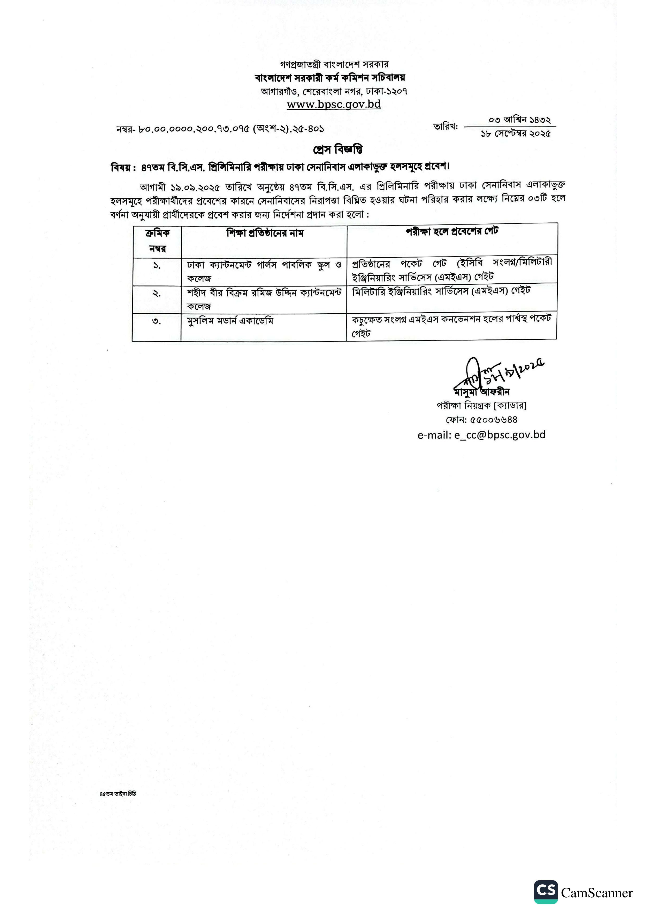 আগামী ১৯.০৯.২০২৫ তারিখে অনুষ্ঠিতব্য এ পরীক্ষায় সেনানিবাসের নিরাপত্তা বিঘ্নিত হওয়ার ঘটনা পরিহার করার লক্ষ্যে ০৩টি হলে প্রার্থীদের প্রবেশের জন্য সুনির্দিষ্ট গেট ব্যবহারের নির্দেশনা প্রদান করা হয়েছে। পরীক্ষার্থীদের সেনানিবাসের নিয়মাবলী অনুসরণ করে নির্ধারিত গেট ব্যবহার করে পরীক্ষা কেন্দ্রে প্রবেশ করতে বলা হয়েছে।