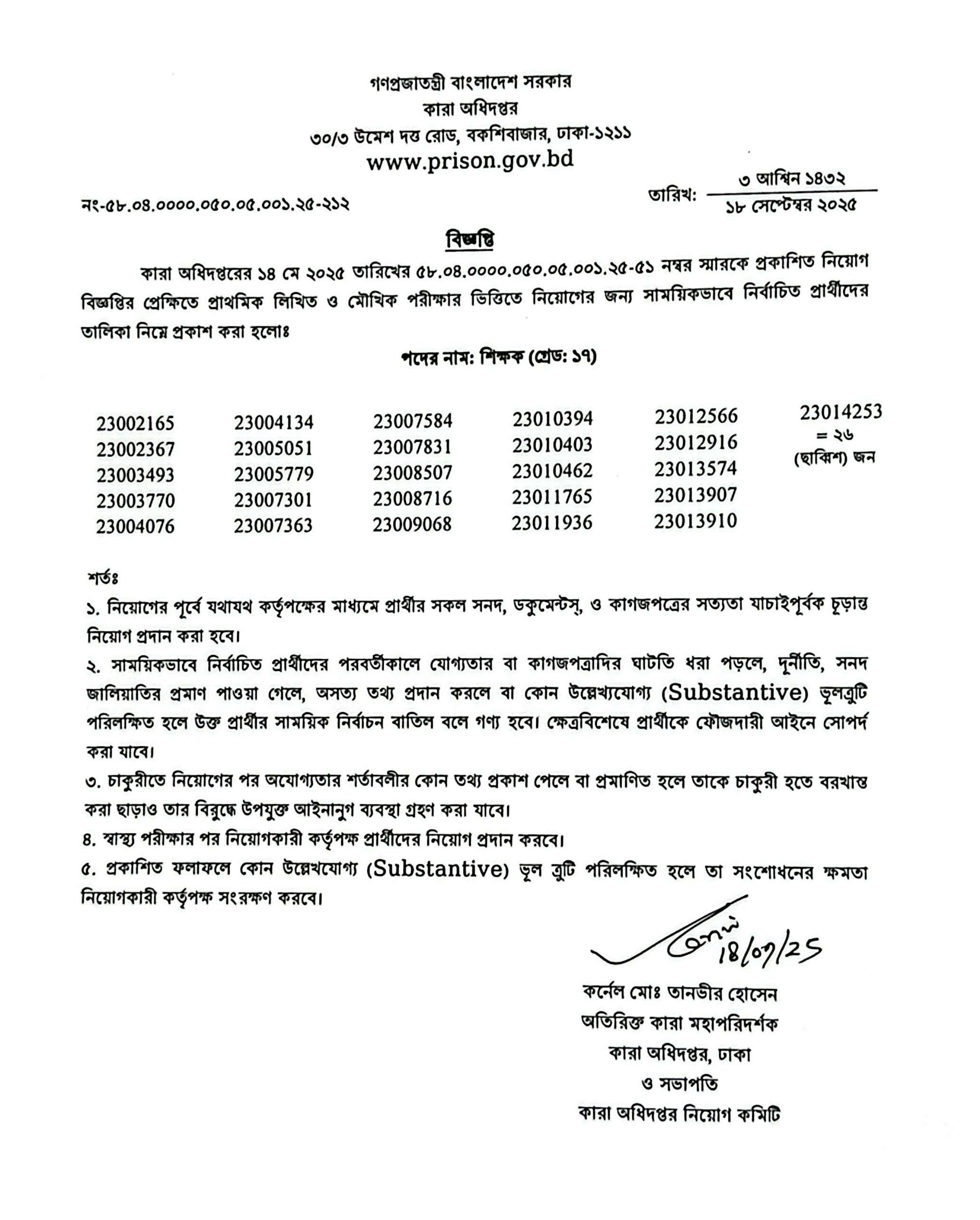 কারা অধিদপ্তরের ১৪ মে ২০২৫ তারিখে প্রকাশিত নিয়োগ বিজ্ঞপ্তির ভিত্তিতে শিক্ষক (গ্রেড: ১৭) পদের জন্য প্রাথমিক লিখিত ও মৌখিক পরীক্ষার পর সাময়িকভাবে নির্বাচিত প্রার্থীদের তালিকা প্রকাশ করা হয়েছে।