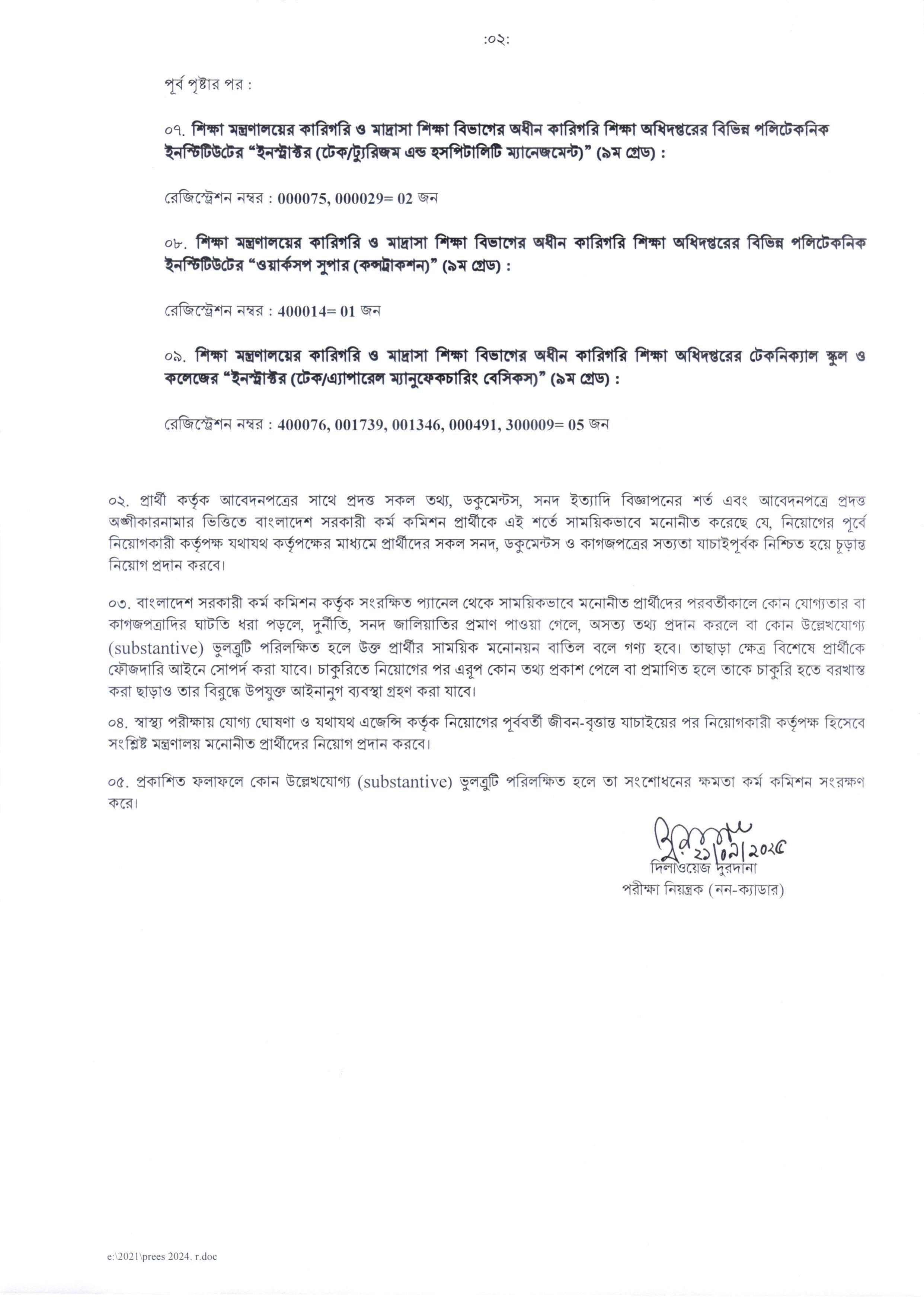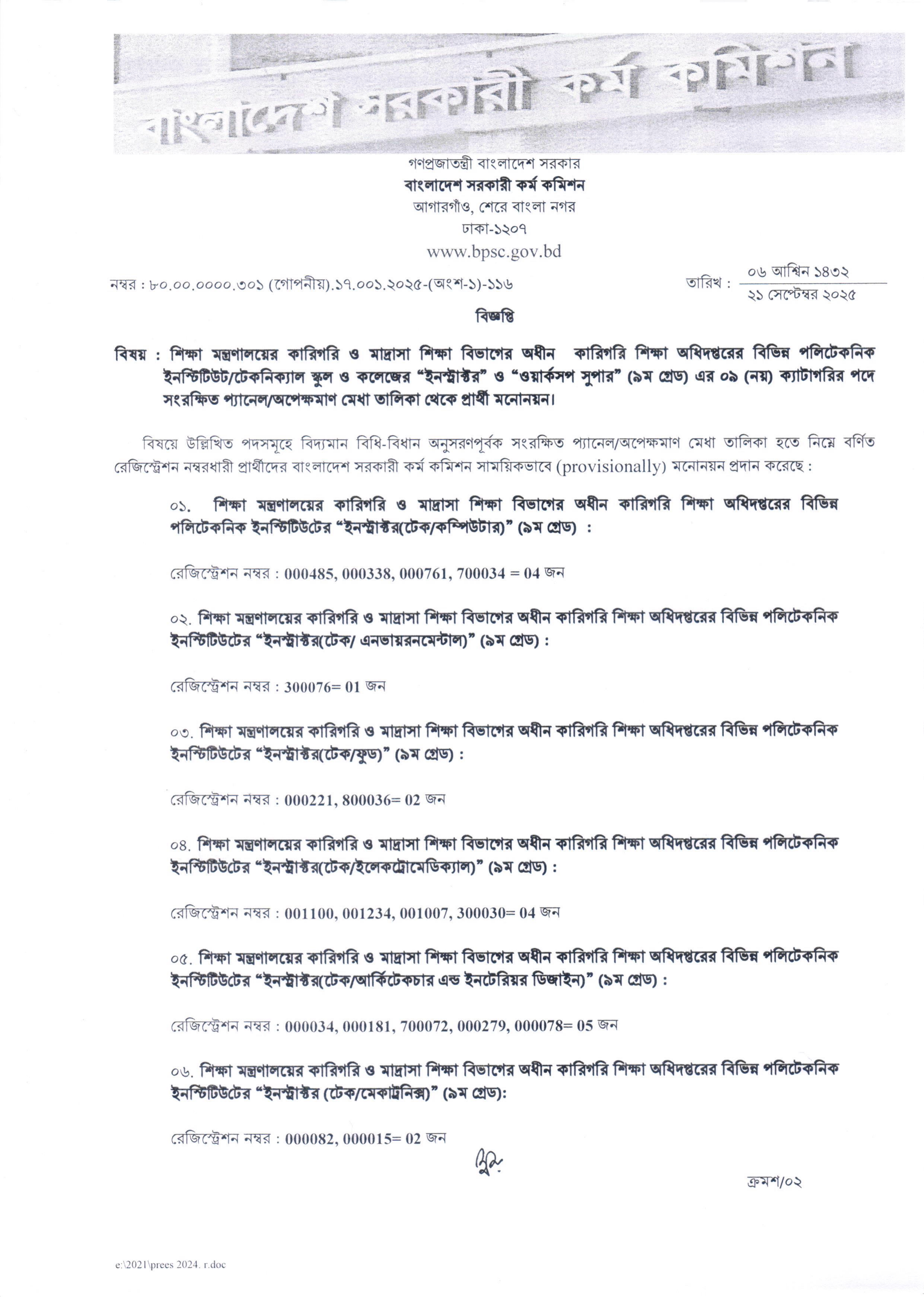 বাংলাদেশ সরকারী কর্ম কমিশন (BPSC) শিক্ষা মন্ত্রণালয়ের কারিগরি ও মাদ্রাসা শিক্ষা বিভাগের অধীন কারিগরি শিক্ষা অধিদপ্তরের বিভিন্ন পলিটেকনিক ইনস্টিটিউট এবং টেকনিক্যাল স্কুল ও কলেজের ৯টি ক্যাটাগরির পদে সংরক্ষিত প্যানেল/অপেক্ষমাণ মেধা তালিকা থেকে প্রার্থী মনোনয়ন প্রদান করেছে।
