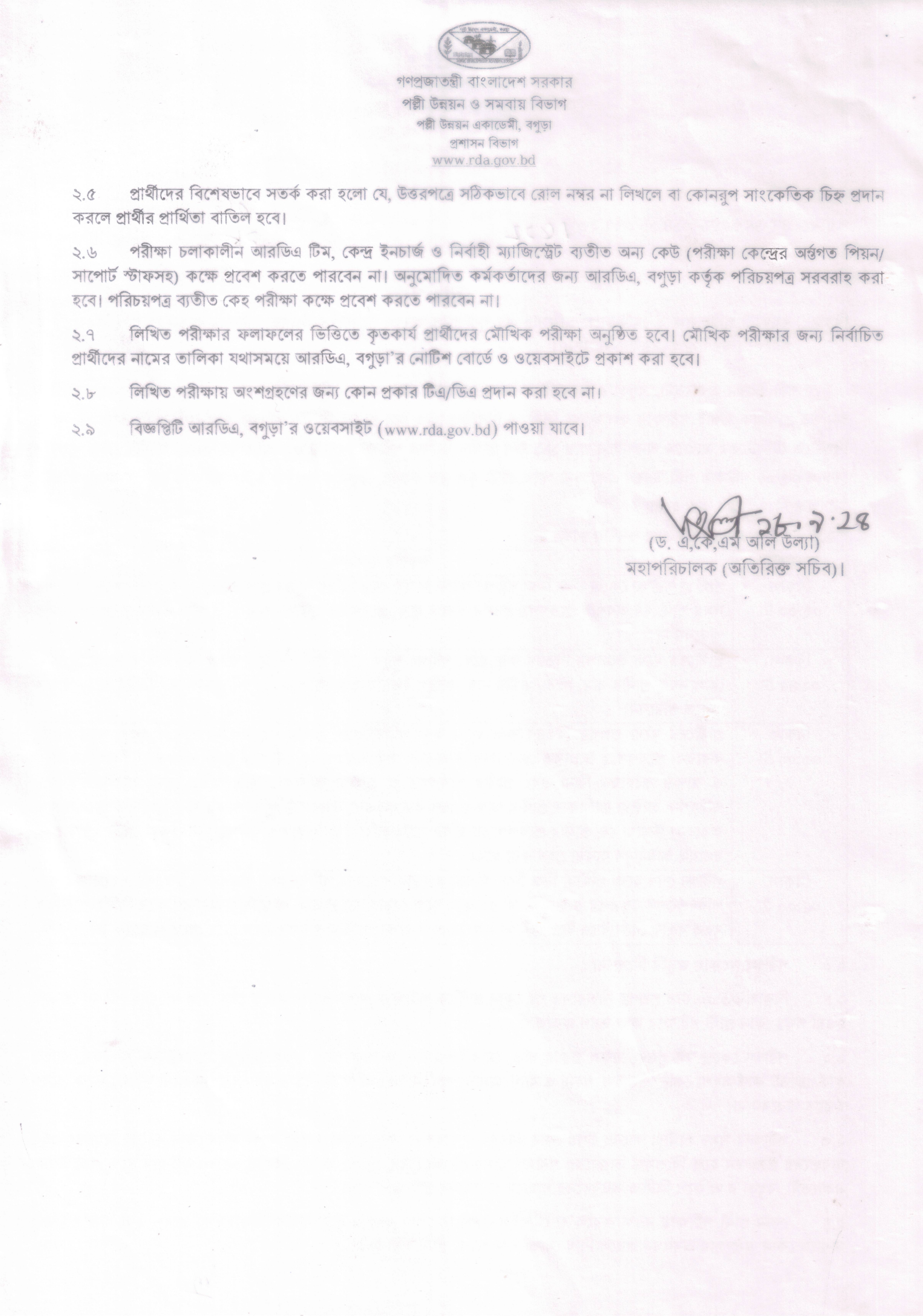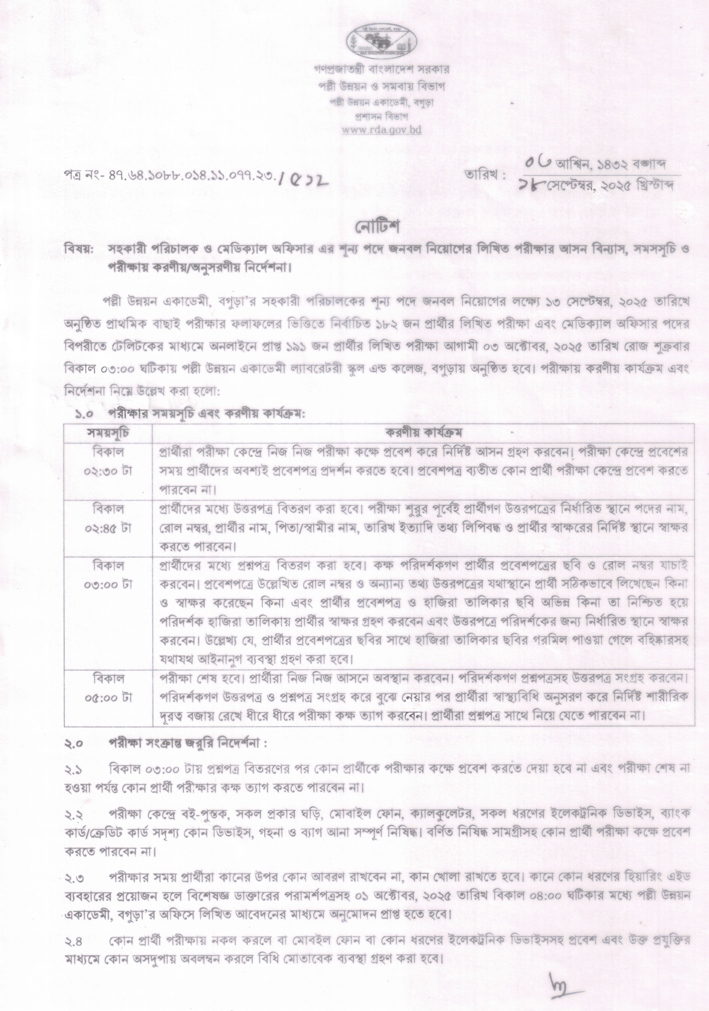 পল্লী উন্নয়ন একাডেমী, বগুড়ার সহকারী পরিচালক ও মেডিক্যাল অফিসার পদের লিখিত পরীক্ষার আসন বিন্যাস, সময়সূচি ও পরীক্ষা সংক্রান্ত নির্দেশাবলী প্রকাশ করা হয়েছে।