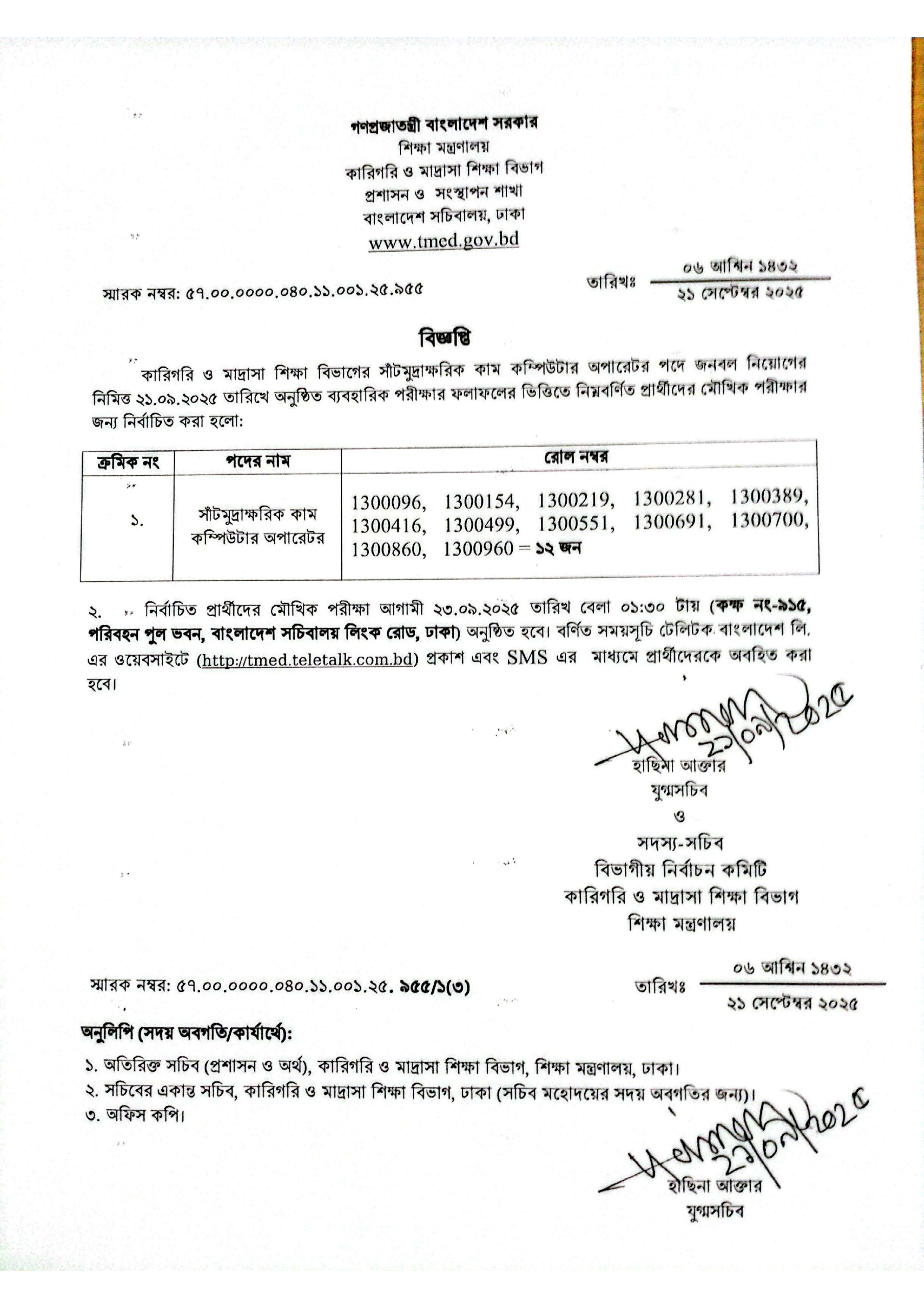 শিক্ষা মন্ত্রণালয়ের অধীন কারিগরি ও মাদ্রাসা শিক্ষা বিভাগের সাঁটমুদ্রাক্ষরিক কাম কম্পিউটার অপারেটর পদের ব্যবহারিক পরীক্ষার ফলাফল প্রকাশিত হয়েছে। এই পদের জন্য মোট ১২ জন প্রার্থীকে মৌখিক পরীক্ষার জন্য প্রাথমিকভাবে নির্বাচিত করা হয়েছে।