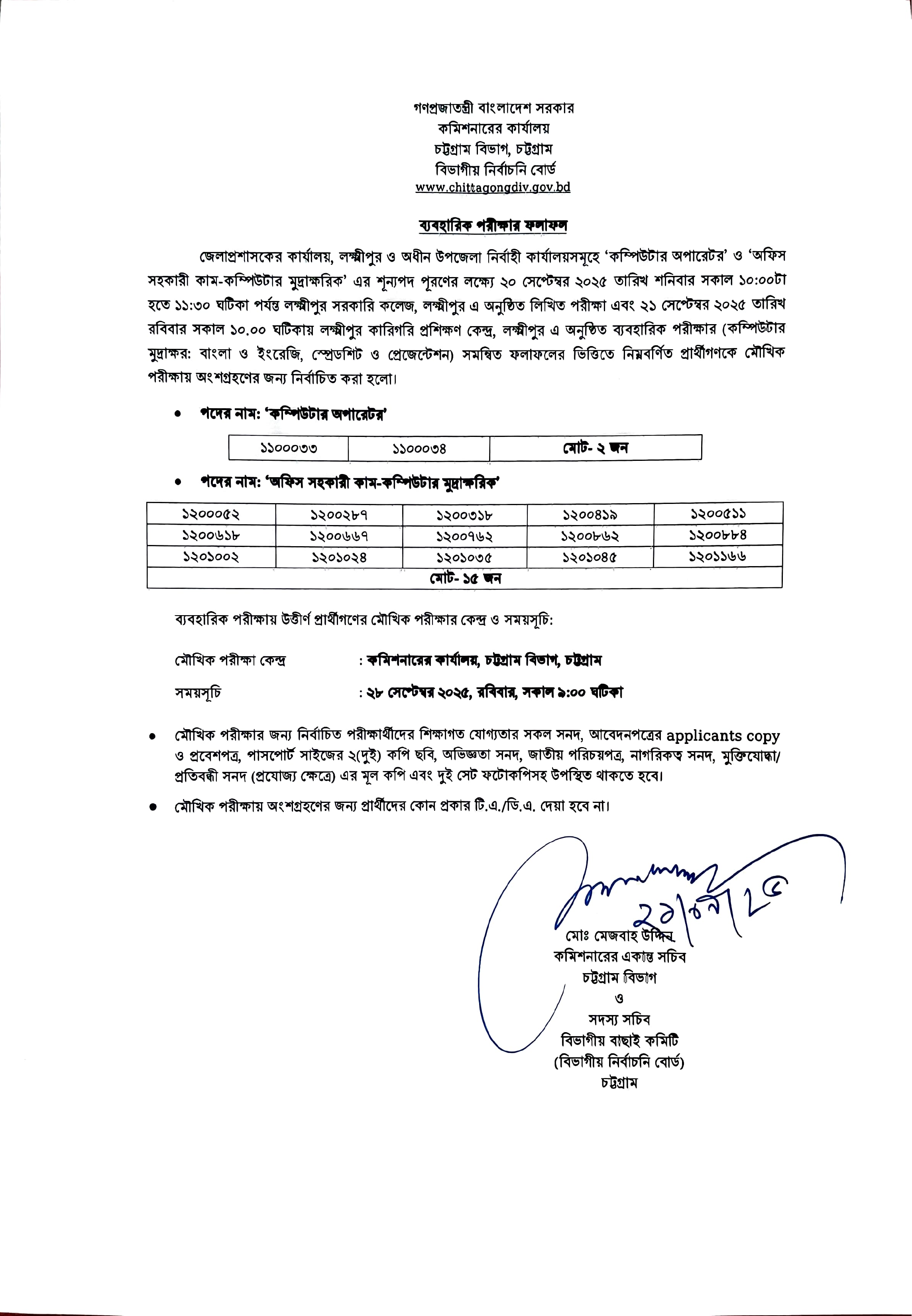 গণপ্রজাতন্ত্রী বাংলাদেশ সরকারের চট্টগ্রাম বিভাগীয় নির্বাচনি বোর্ড কর্তৃক লক্ষ্মীপুর জেলাপ্রশাসকের কার্যালয় ও অধীন উপজেলা নির্বাহী কার্যালয়সমূহে 'কম্পিউটার অপারেটর' (২ জন) এবং 'অফিস সহকারী কাম-কম্পিউটার মুদ্রাক্ষরিক' (১৫ জন) পদের শূন্যপদ পূরণের লক্ষ্যে অনুষ্ঠিত ব্যবহারিক পরীক্ষার ফলাফল প্রকাশিত হয়েছে।