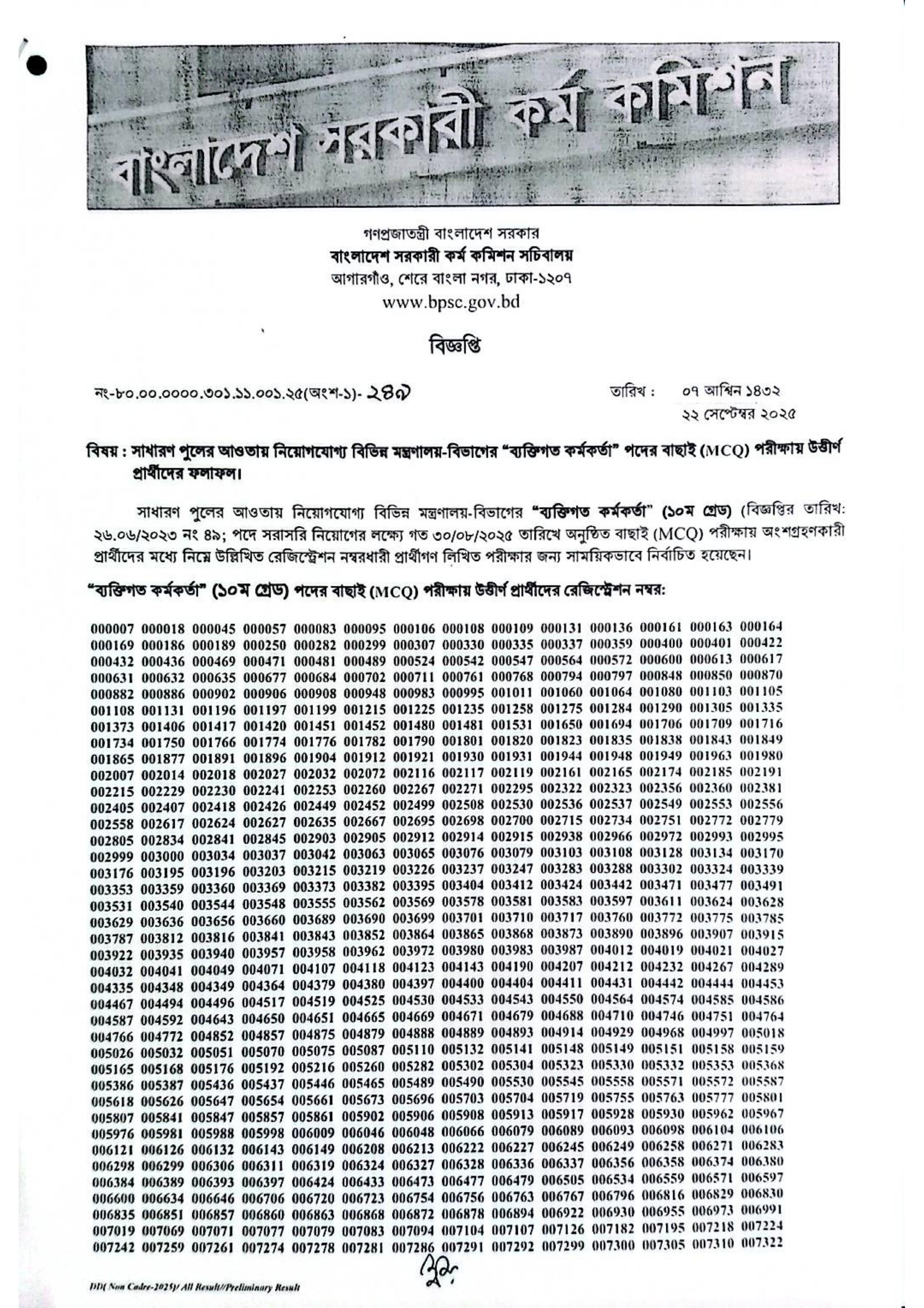 বাংলাদেশ সরকারী কর্ম কমিশন (BPSC) কর্তৃক সাধারণ পুলের আওতায় নিয়োগযোগ্য বিভিন্ন মন্ত্রণালয়-বিভাগের “ব্যক্তিগত কর্মকর্তা” (১০ম গ্রেড) পদের বাছাই (MCQ) পরীক্ষার ফলাফল প্রকাশ করা হয়েছে।