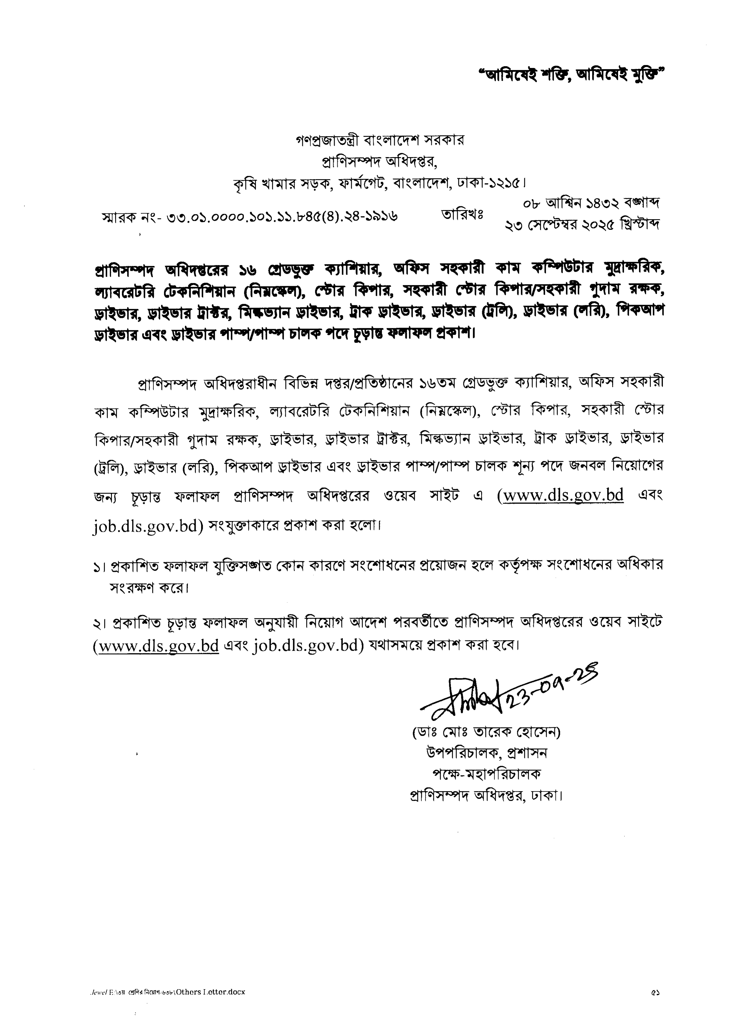 কর্তৃপক্ষ প্রকাশিত ফলাফল সংশোধনের অধিকার সংরক্ষণ করে। নির্বাচিত প্রার্থীদের নিয়োগ আদেশ পরবর্তীতে প্রাণিসম্পদ অধিদপ্তরের অফিসিয়াল ওয়েবসাইটে (dls.gov.bd) যথাসময়ে প্রকাশ করা হবে।