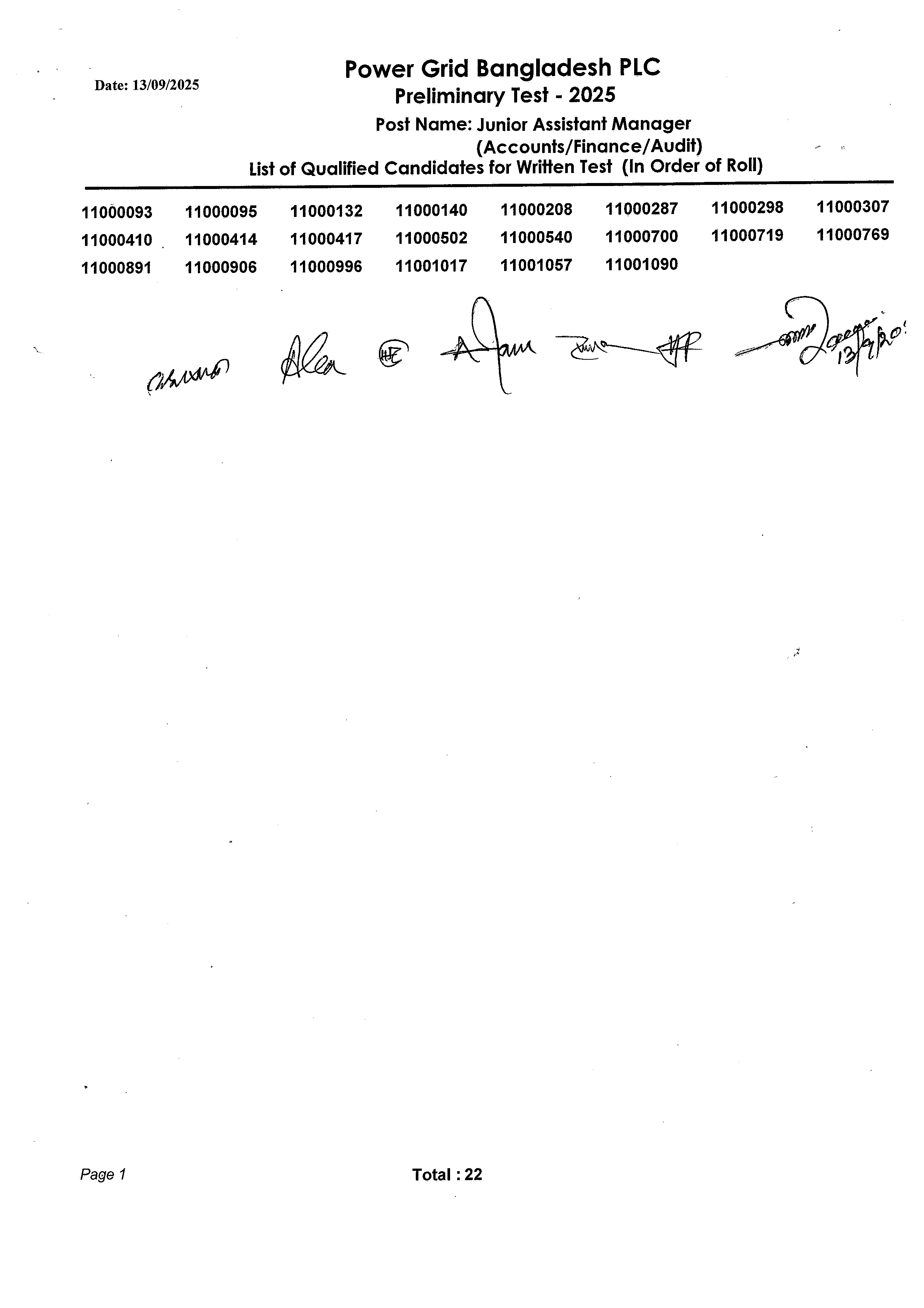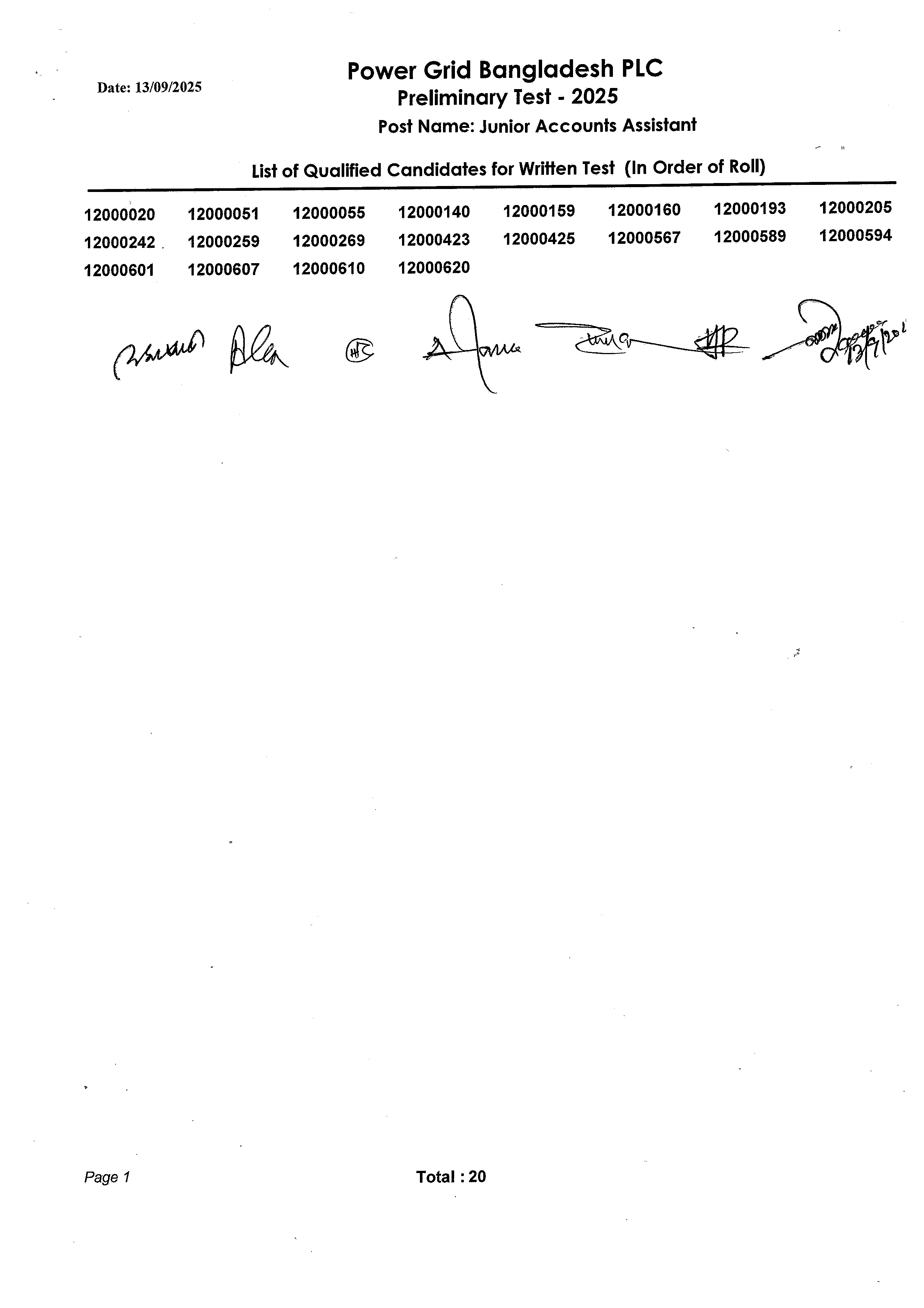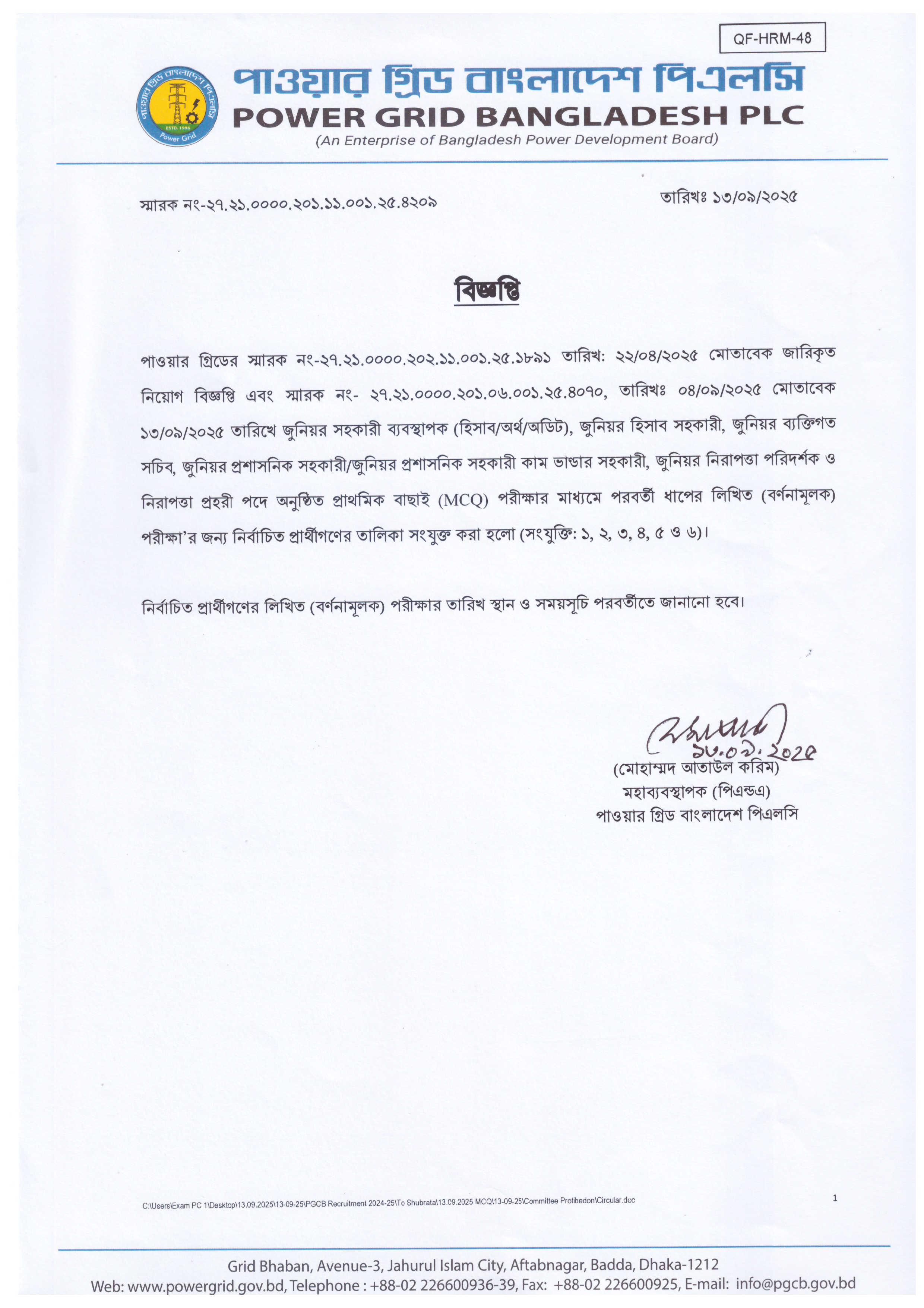পাওয়ার গ্রিড বাংলাদেশ পিএলসি (Power Grid Bangladesh PLC) কর্তৃক আয়োজিত জুনিয়র সহকারী ব্যবস্থাপক (হিসাব/অর্থ/অডিট), জুনিয়র হিসাব সহকারী এবং জুনিয়র ব্যক্তিগত নিরাপত্তা প্রহরী পদের প্রাথমিক বাছাই (লিখিত) পরীক্ষার ফলাফল প্রকাশিত হয়েছে।