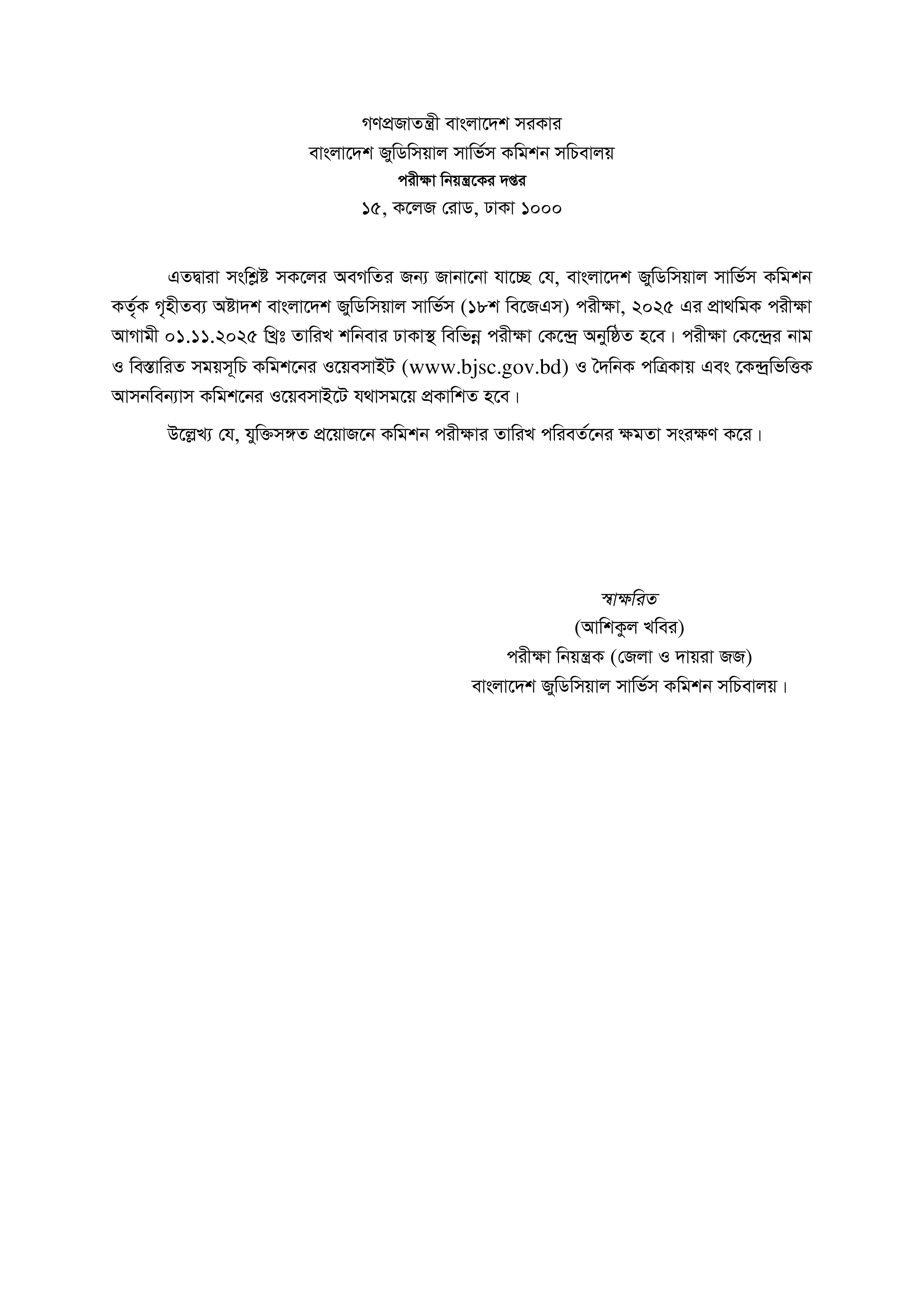 বাংলাদেশ জুডিসিয়াল সার্ভিস কমিশন কর্তৃক গৃহীতব্য অষ্টাদশ বাংলাদেশ জুডিসিয়াল সার্ভিস (১৮শ বিজেএস) পরীক্ষা, ২০২৫ এর প্রাথমিক পরীক্ষার তারিখ ঘোষণা করা হয়েছে।