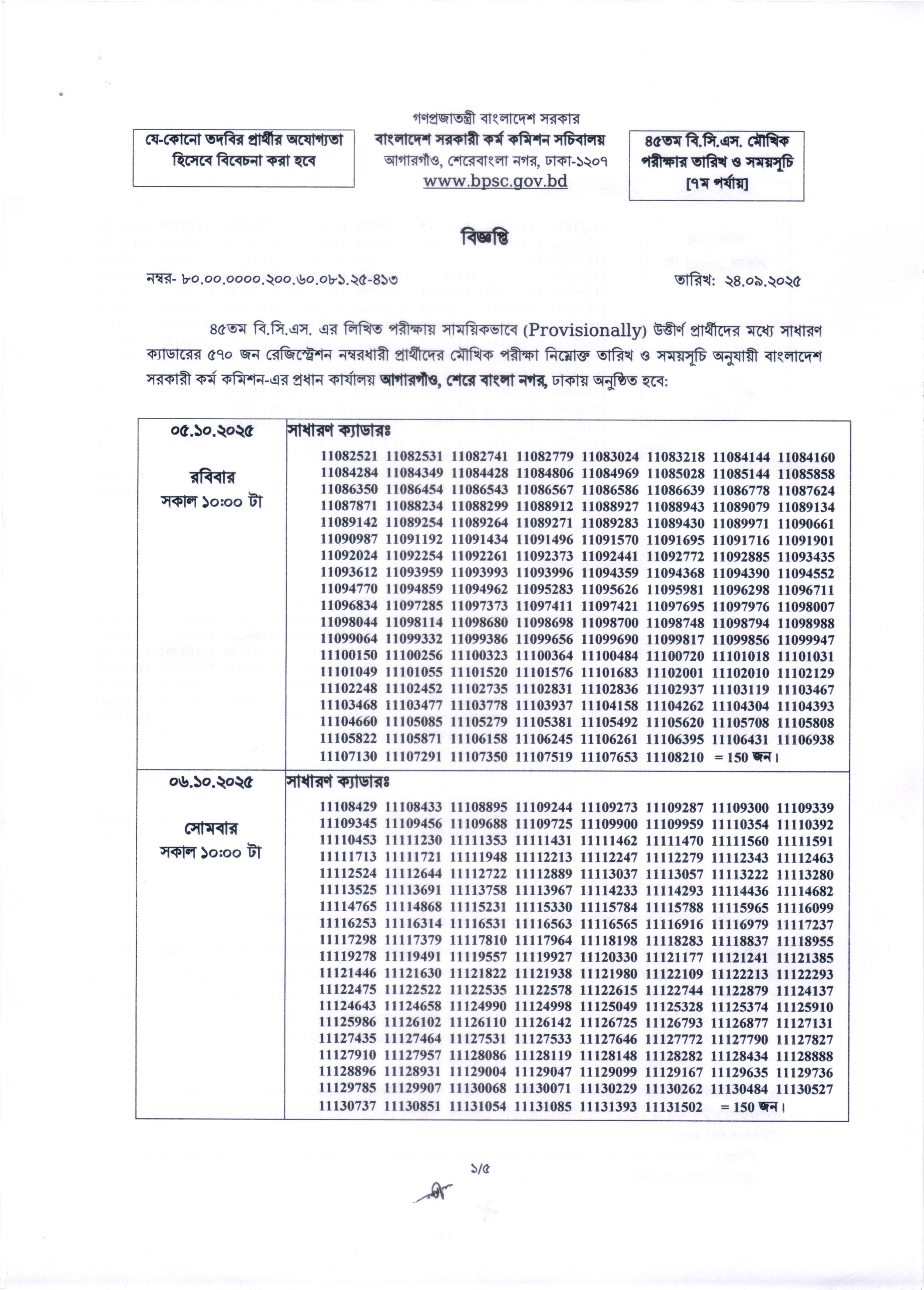বাংলাদেশ সরকারী কর্ম কমিশন (BPSC) ৪৫তম বিসিএস পরীক্ষার লিখিত পরীক্ষায় সাময়িকভাবে উত্তীর্ণ ৫৭০ জন সাধারণ ক্যাডার প্রার্থীর মৌখিক পরীক্ষার সময়সূচি প্রকাশ করেছে।