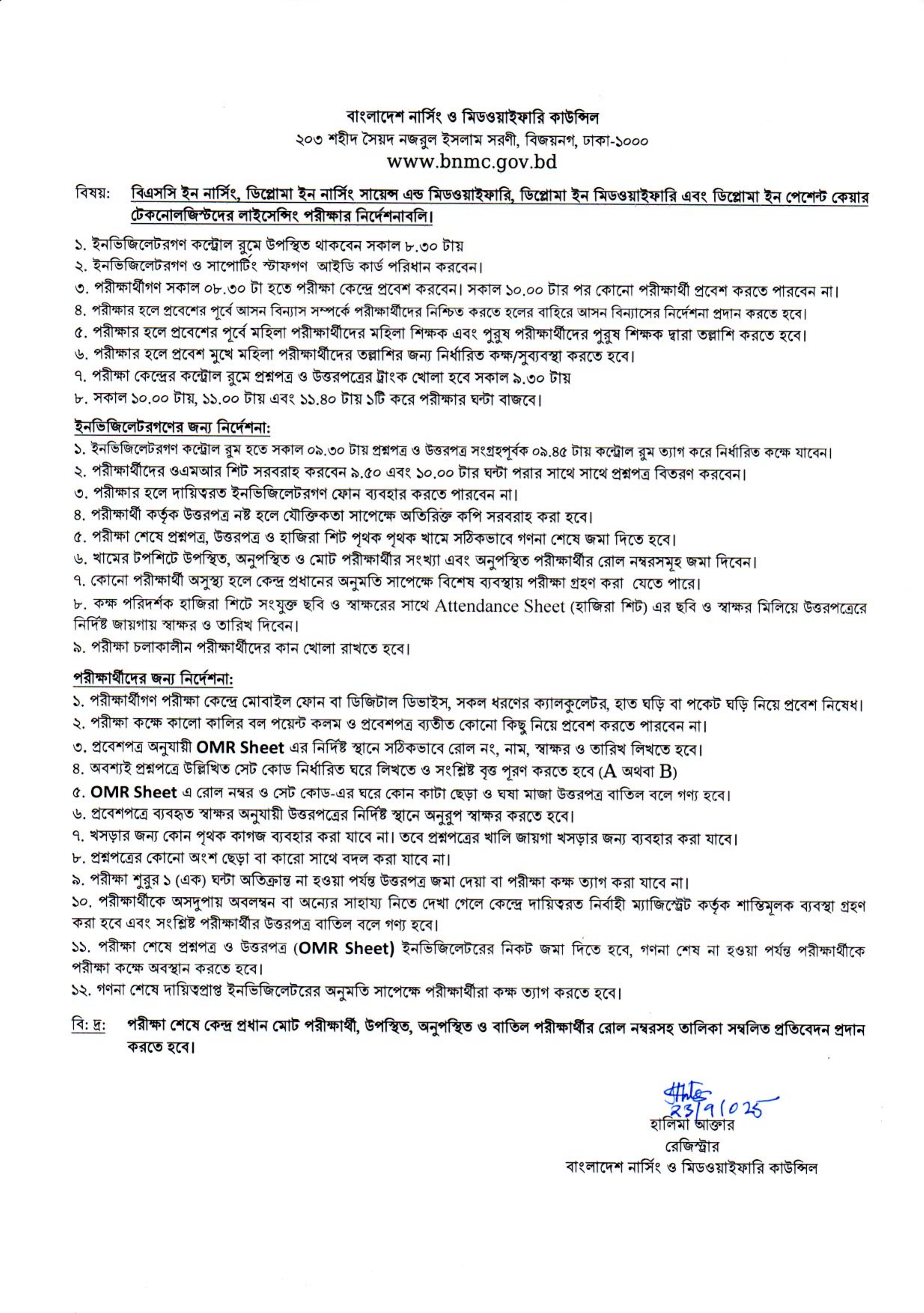 বাংলাদেশ নার্সিং ও মিডওয়াইফারি কাউন্সিল কর্তৃক বিএসসি ইন নার্সিং, ডিপ্লোমা ইন নার্সিং সায়েন্স এন্ড মিডওয়াইফারি, ডিপ্লোমা ইন মিডওয়াইফারি এবং ডিপ্লোমা ইন পেশেন্ট কেয়ার টেকনোলজিস্টদের লাইসেন্সিং পরীক্ষার জন্য গুরুত্বপূর্ণ নির্দেশনাবলি প্রকাশ করা হয়েছে।