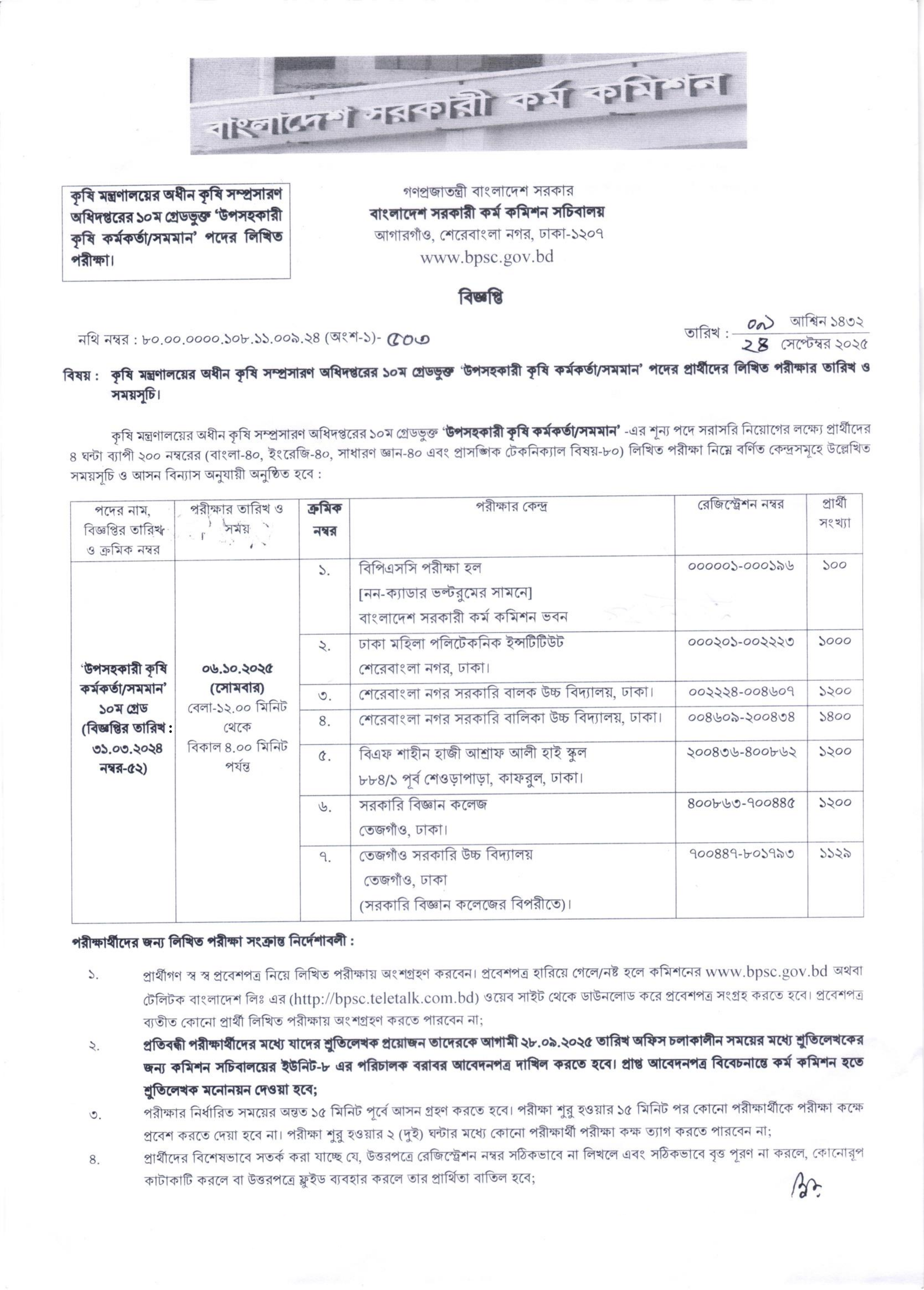 বাংলাদেশ সরকারী কর্ম কমিশন (BPSC) কৃষি মন্ত্রণালয়ের অধীন কৃষি সম্প্রসারণ অধিদপ্তরের ১০ম গ্রেডভুক্ত উপসহকারী কৃষি কর্মকর্তা/সমমান পদের লিখিত পরীক্ষার সময়সূচি প্রকাশ করেছে।