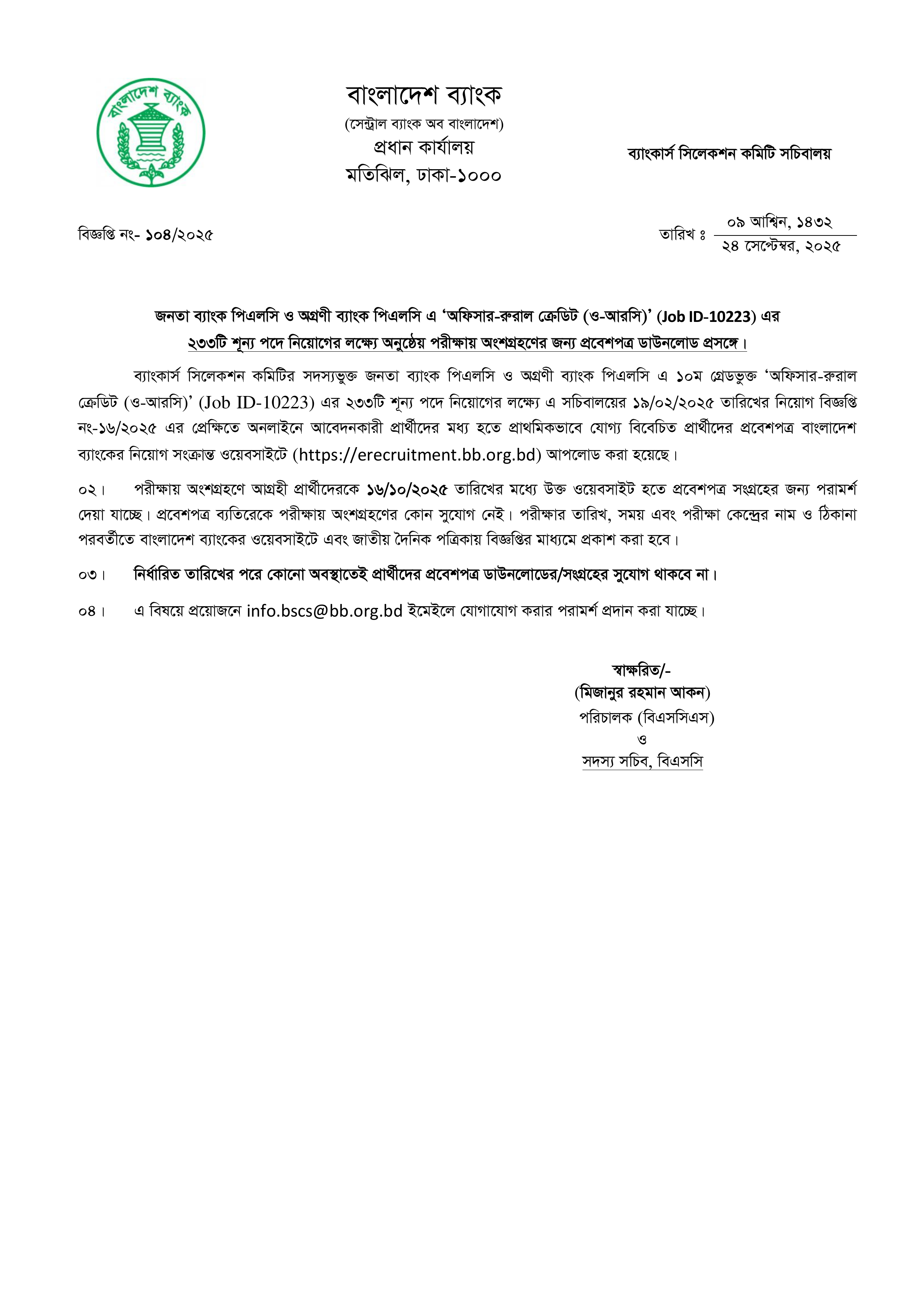 ব্যাংকার্স সিলেকশন কমিটির সদস্যভুক্ত জনতা ব্যাংক পিএলসি ও অগ্রণী ব্যাংক পিএলসি এর 'অফিসার-রুরাল ক্রেডিট (ও-আরসি)' পদে মোট ২৩৩টি শূন্য পদের নিয়োগ পরীক্ষার জন্য প্রবেশপত্র ডাউনলোড সংক্রান্ত বিজ্ঞপ্তি প্রকাশ করা হয়েছে।