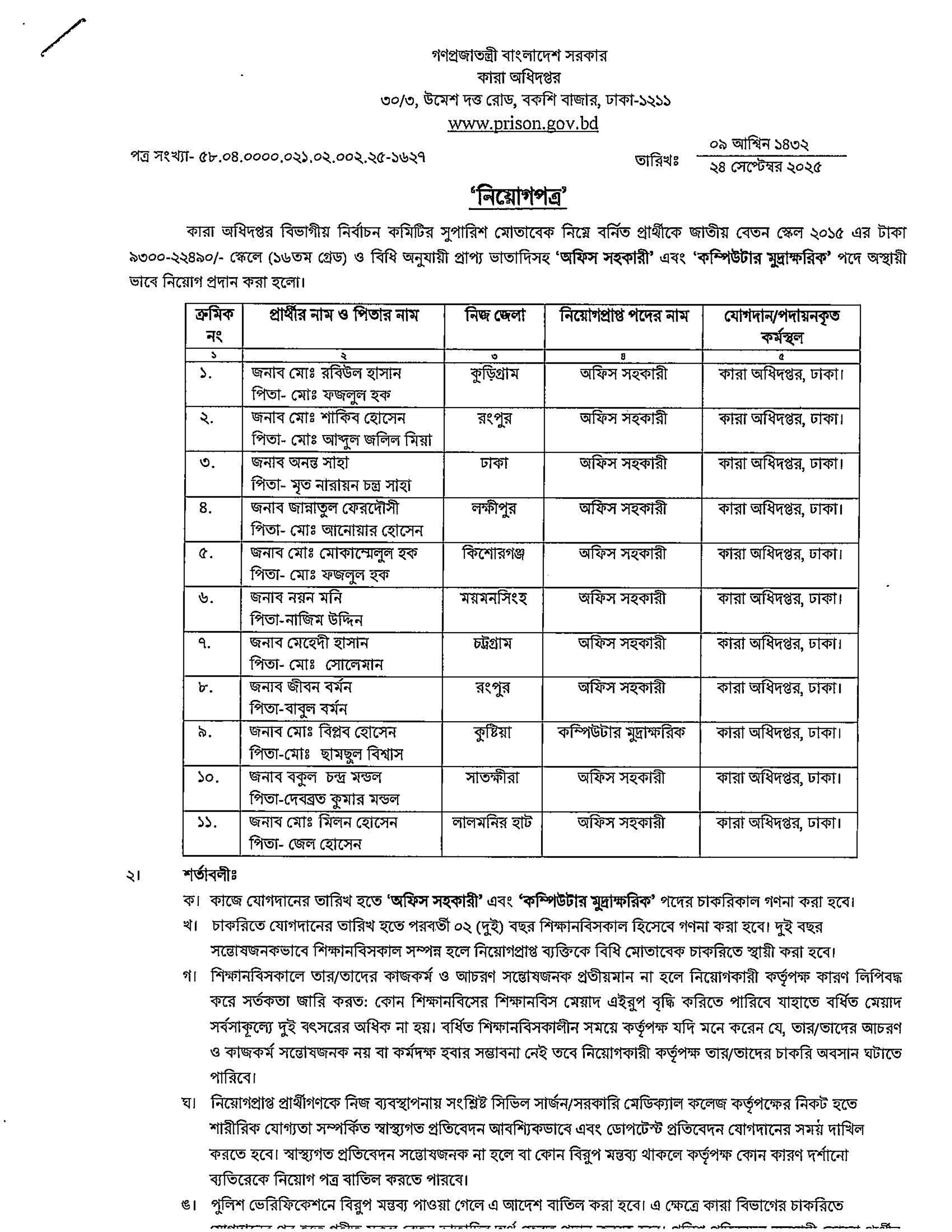 কারা অধিদপ্তর কর্তৃক ১১ জন প্রার্থীকে "অফিস সহকারী" এবং "কম্পিউটার মুদ্রাক্ষরিক" পদে অস্থায়ীভাবে নিয়োগের জন্য নিয়োগপত্র প্রকাশ করা হয়েছে। এই নিয়োগের মাধ্যমে ১০ জন অফিস সহকারী এবং ১ জন কম্পিউটার মুদ্রাক্ষরিক পদে যোগদান করবেন।