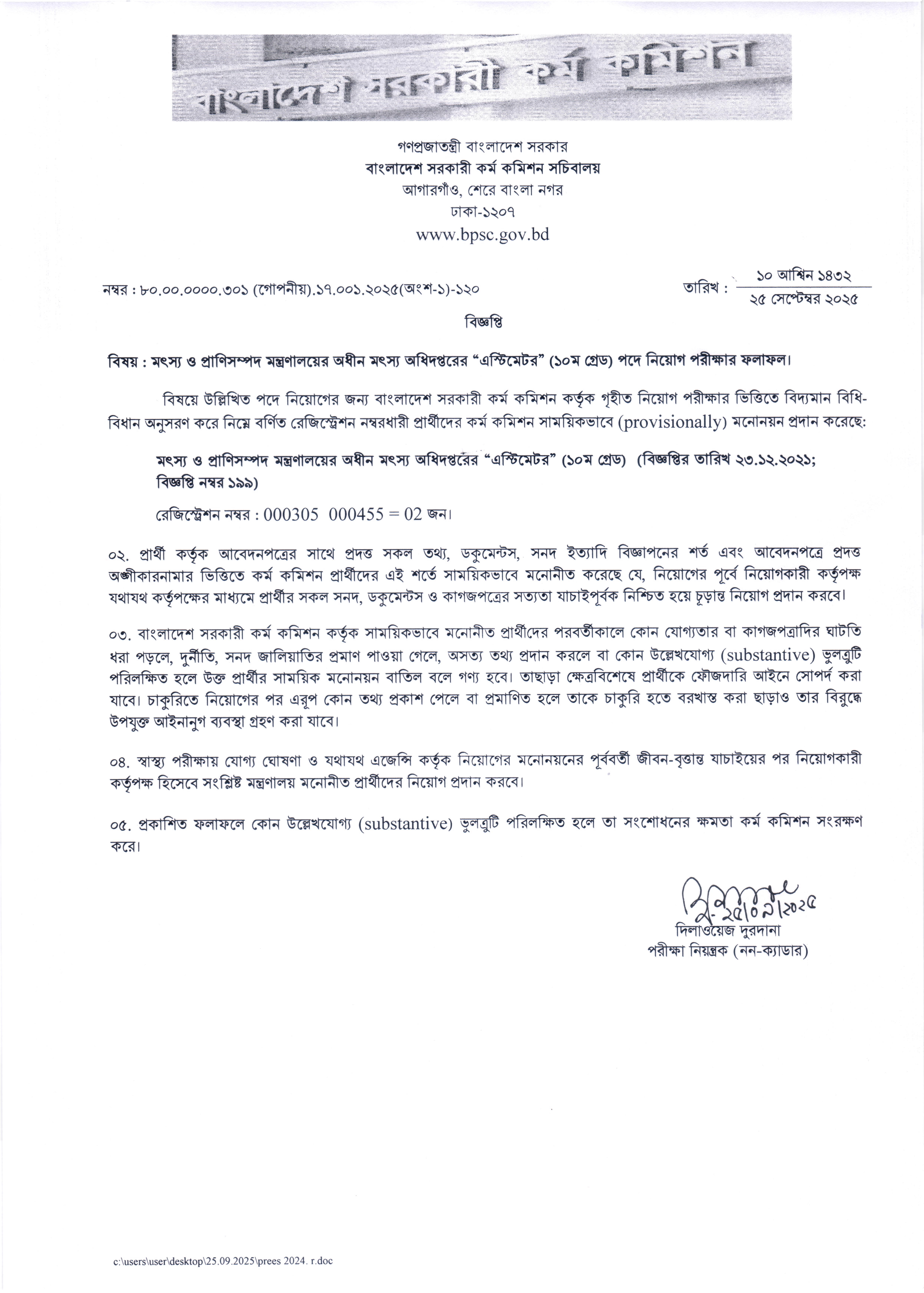 বাংলাদেশ সরকারী কর্ম কমিশন কর্তৃক মৎস্য ও প্রাণিসম্পদ মন্ত্রণালয়ের অধীন মৎস্য অধিদপ্তরের "এস্টিমেটর" (১০ম গ্রেড) পদের নিয়োগ পরীক্ষার ফলাফল প্রকাশিত হয়েছে।
