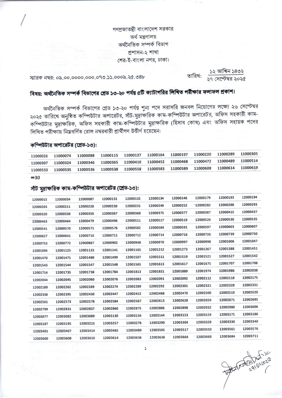 অর্থনৈতিক সম্পর্ক বিভাগের চাকরির পরীক্ষার ফলাফল প্রকাশ