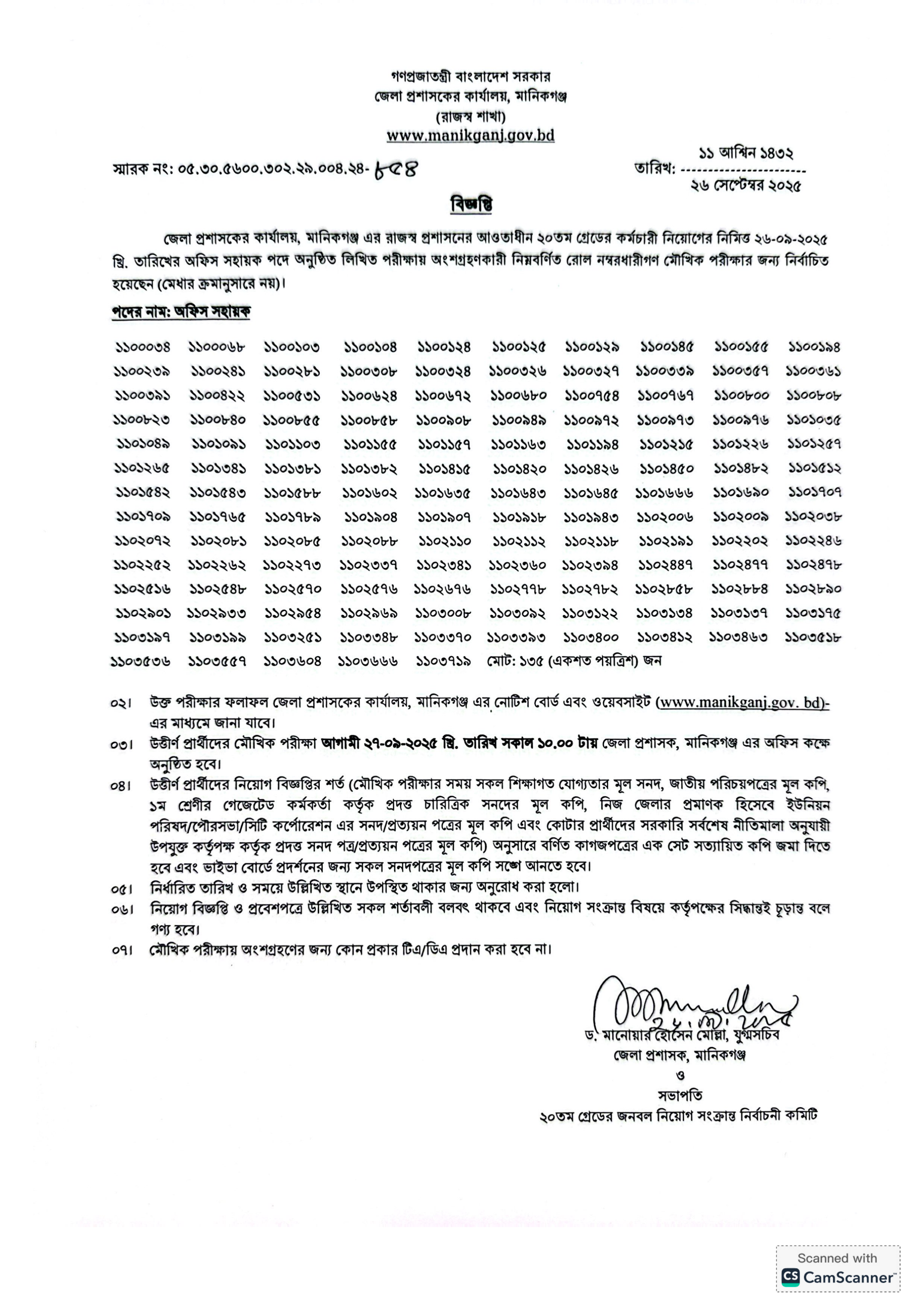 জেলা প্রশাসকের কার্যালয়, মানিকগঞ্জ এর রাজস্ব প্রশাসনের আওতাধীন অফিস সহায়ক পদে (২০তম গ্রেড) গত ২৬ সেপ্টেম্বর ২০২৫ তারিখে অনুষ্ঠিত লিখিত পরীক্ষায় ১৩৫ জন প্রার্থী মৌখিক পরীক্ষার জন্য নির্বাচিত হয়েছেন।