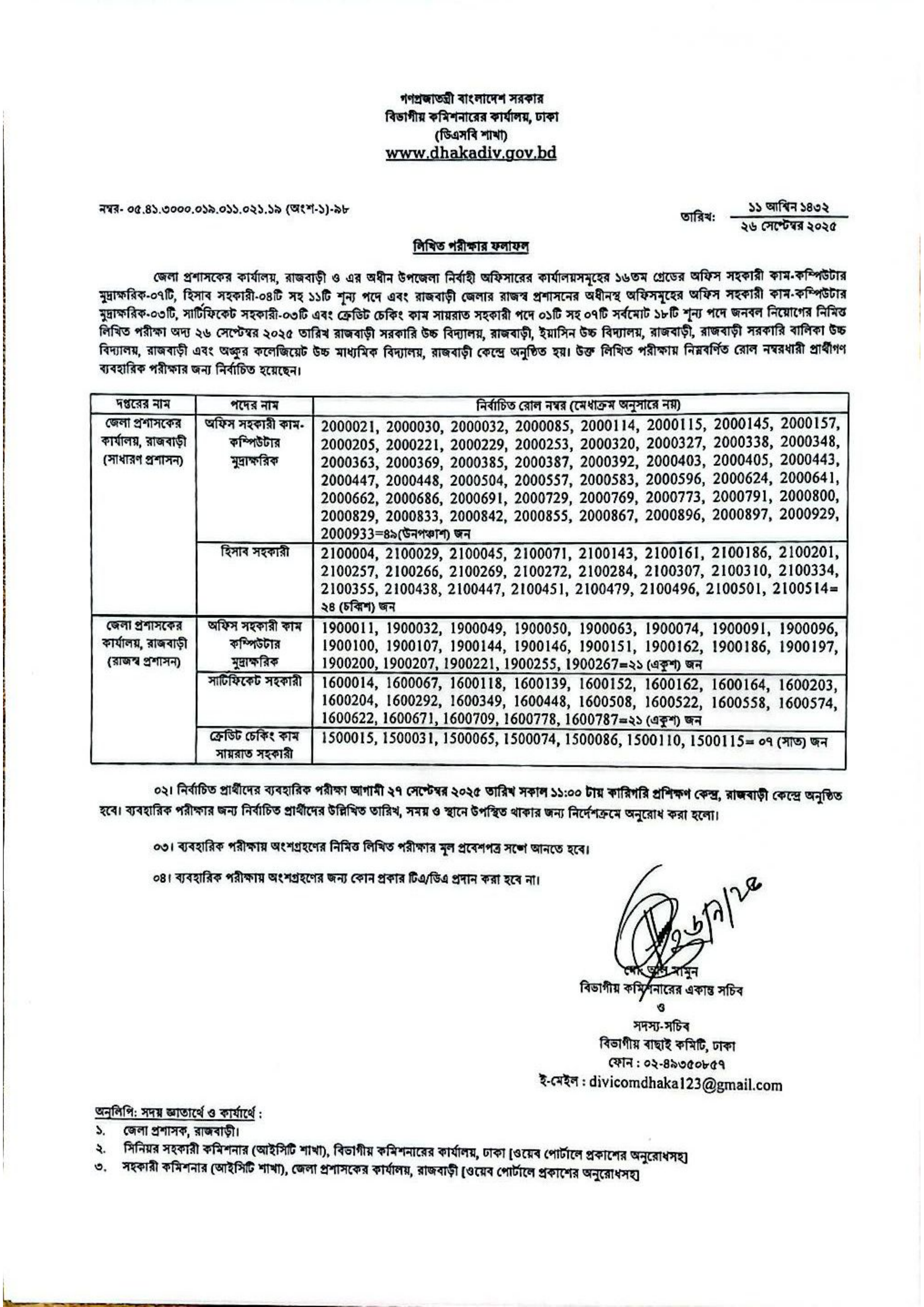 জেলা প্রশাসকের কার্যালয়, রাজবাড়ী এর অধীনস্থ বিভিন্ন অফিসের শূন্য পদে জনবল নিয়োগের লিখিত পরীক্ষার ফলাফল প্রকাশ করা হয়েছে। উক্ত লিখিত পরীক্ষায় উত্তীর্ণ প্রার্থীগণকে ব্যবহারিক পরীক্ষার জন্য নির্বাচিত করা হয়েছে।