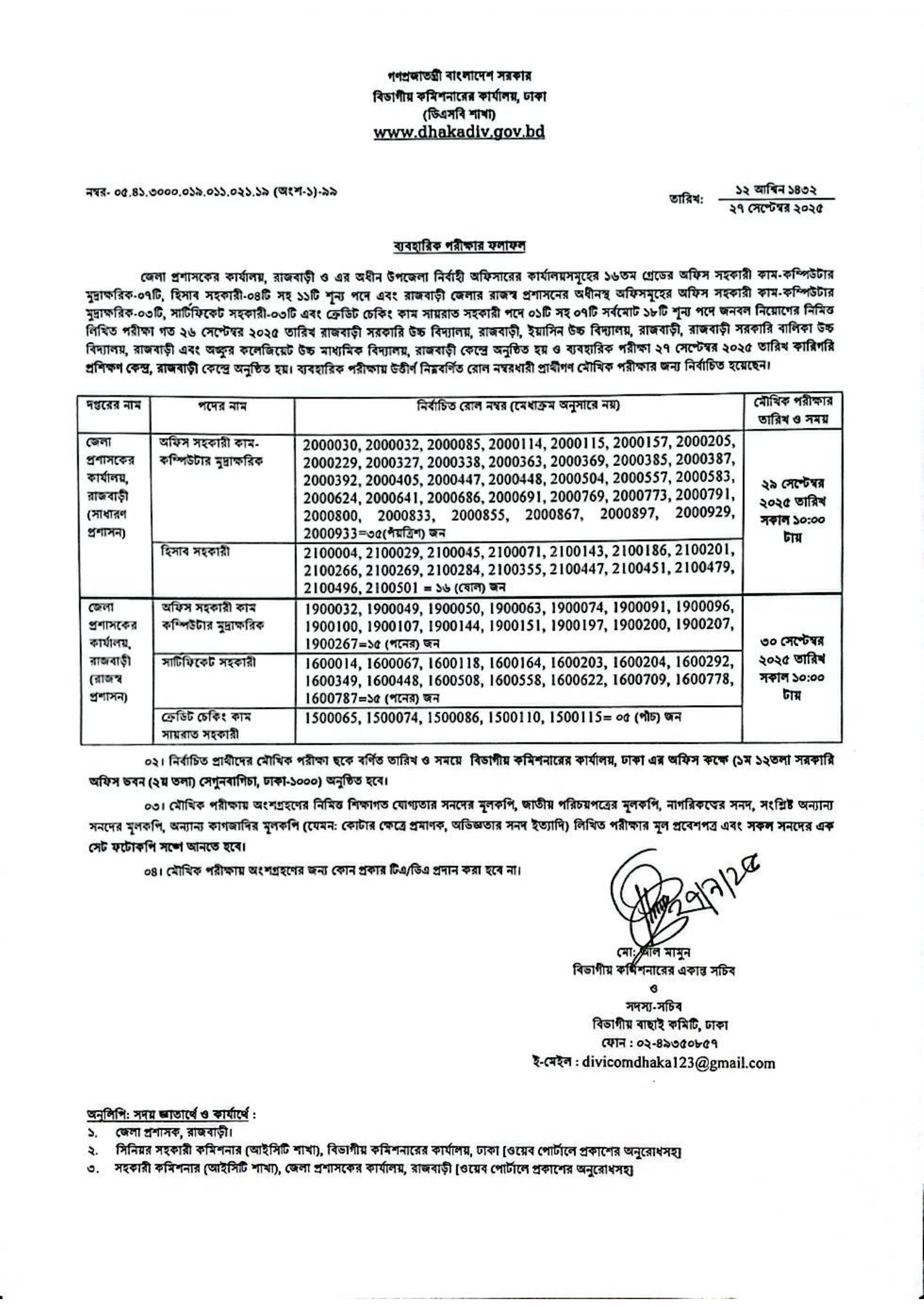 বিভাগীয় কমিশনারের কার্যালয়, ঢাকা এর অধীনে রাজবাড়ী জেলা প্রশাসকের কার্যালয় ও এর অধীন উপজেলা নির্বাহী অফিসারের কার্যালয়সমূহের মোট ১৮টি শূন্য পদে জনবল নিয়োগের ব্যবহারিক পরীক্ষার ফলাফল প্রকাশিত হয়েছে। ব্যবহারিক পরীক্ষায় উত্তীর্ণ প্রার্থীগণকে মৌখিক পরীক্ষার জন্য নির্বাচিত করা হয়েছে।