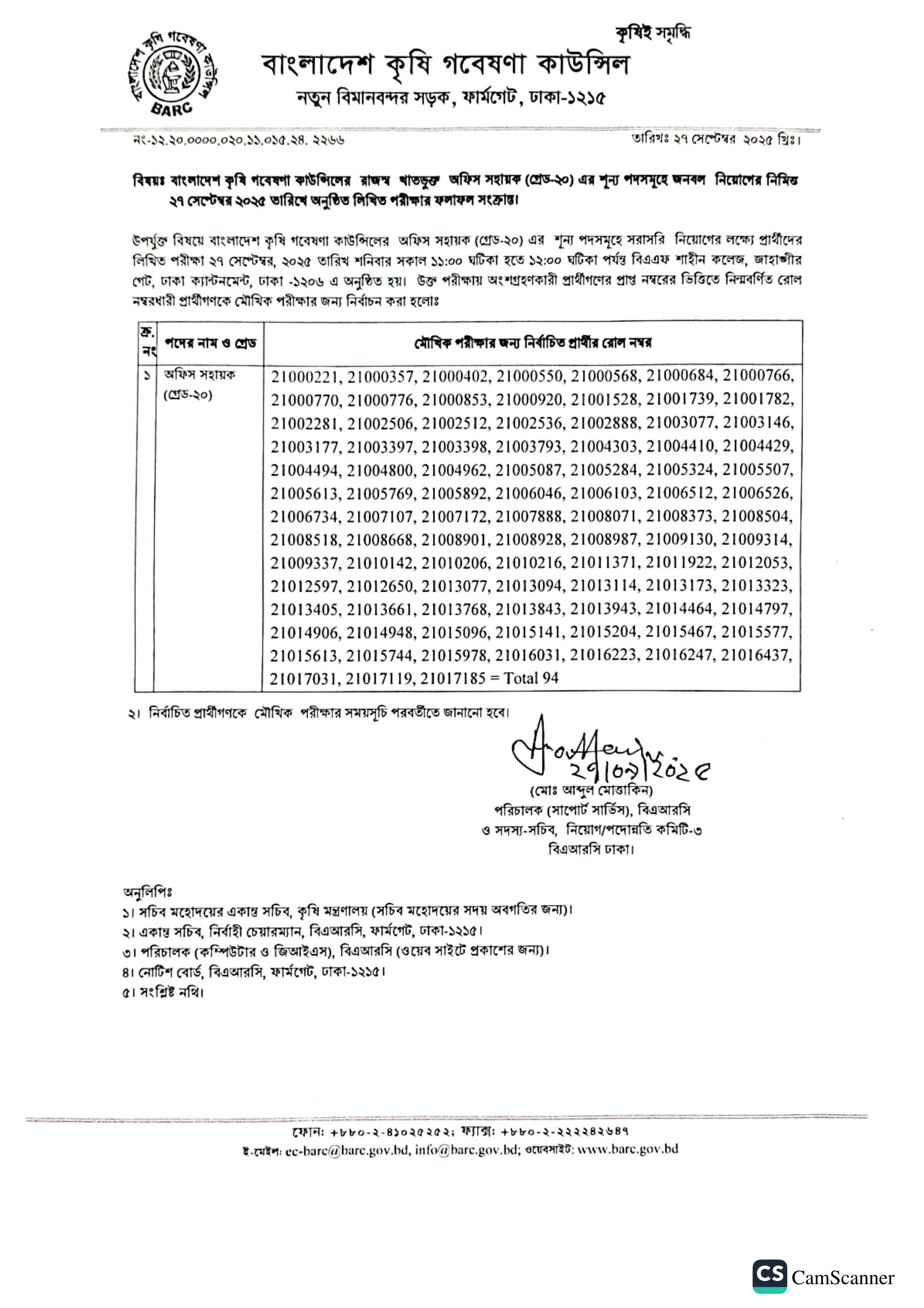 বাংলাদেশ কৃষি গবেষণা কাউন্সিল (BARC) এর অফিস সহায়ক (গ্রেড-২০) পদের লিখিত পরীক্ষার ফলাফল প্রকাশ করা হয়েছে।