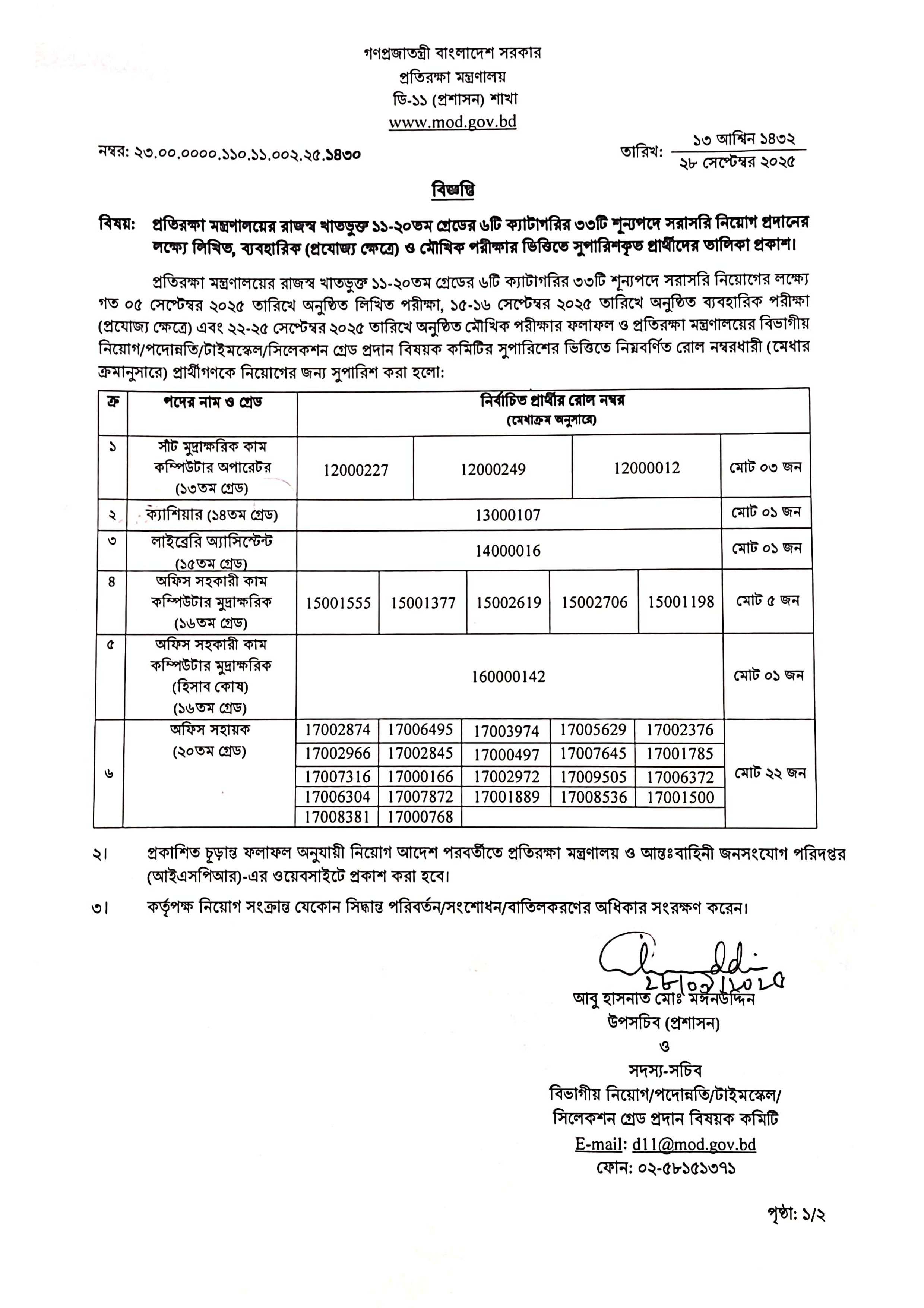 প্রতিরক্ষা মন্ত্রণালয়-এর রাজস্ব খাতভুক্ত ১১-২০তম গ্রেডের ৬টি ক্যাটাগরির ৩৩টি শূন্যপদে সরাসরি নিয়োগের লক্ষ্যে অনুষ্ঠিত লিখিত, ব্যবহারিক ও মৌখিক পরীক্ষার চূড়ান্ত ফলাফল প্রকাশিত হয়েছে।