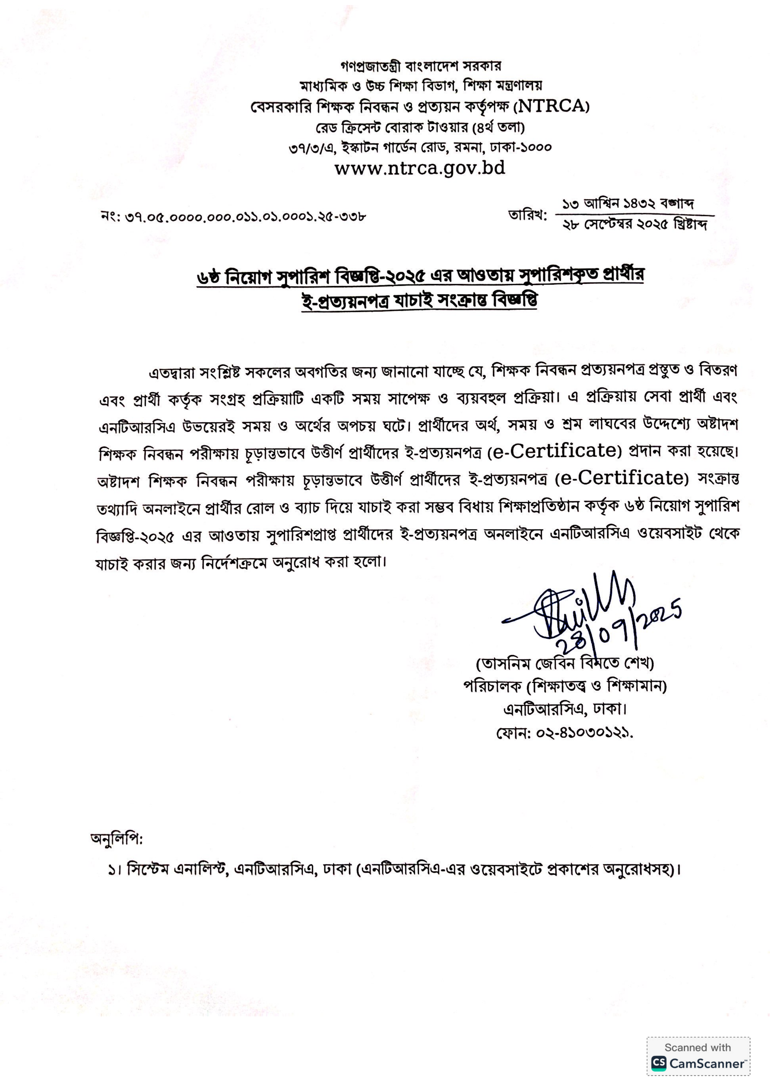 বেসরকারি শিক্ষক নিবন্ধন ও প্রত্যয়ন কর্তৃপক্ষ (এনটিআরসিএ) ৬ষ্ঠ নিয়োগ সুপারিশ বিজ্ঞপ্তি-২০২৫ এর আওতায় সুপারিশপ্রাপ্ত প্রার্থীদের ই-প্রত্যয়নপত্র (e-certificate) যাচাই সংক্রান্ত একটি গুরুত্বপূর্ণ বিজ্ঞপ্তি প্রকাশ করেছে।
