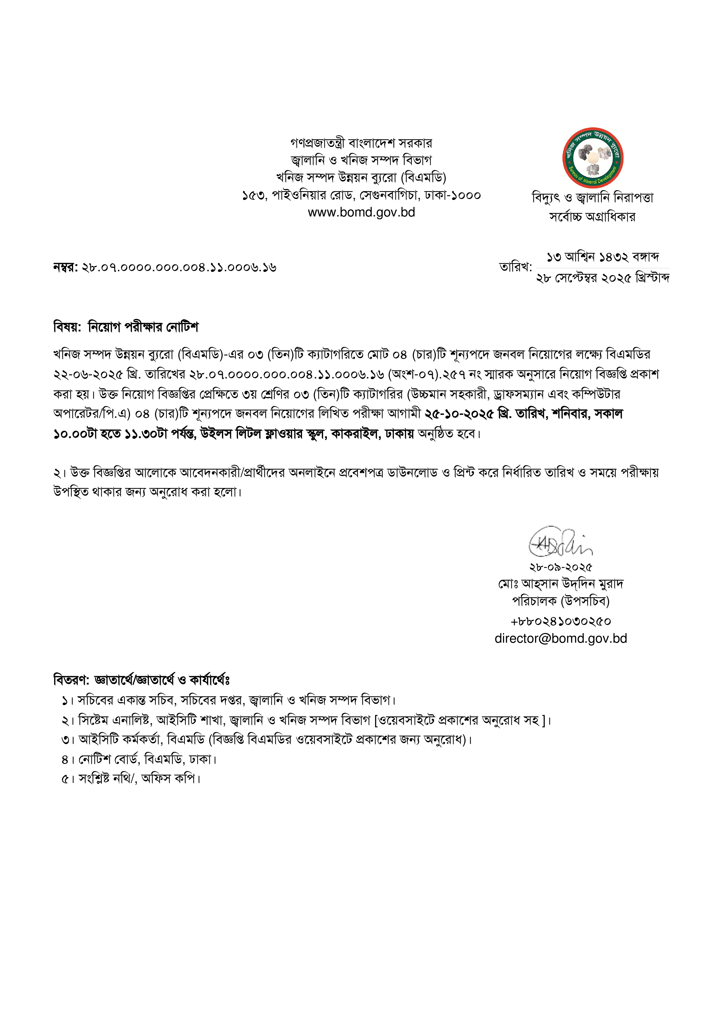খনিজ সম্পদ উন্নয়ন ব্যুরো (বিএমডি)-এর ০৩ (তিন)টি ক্যাটাগরির মোট ০৪ (চার)টি শূন্যপদে জনবল নিয়োগের লক্ষ্যে লিখিত পরীক্ষার তারিখ, সময় ও স্থান ঘোষণা করা হয়েছে।
