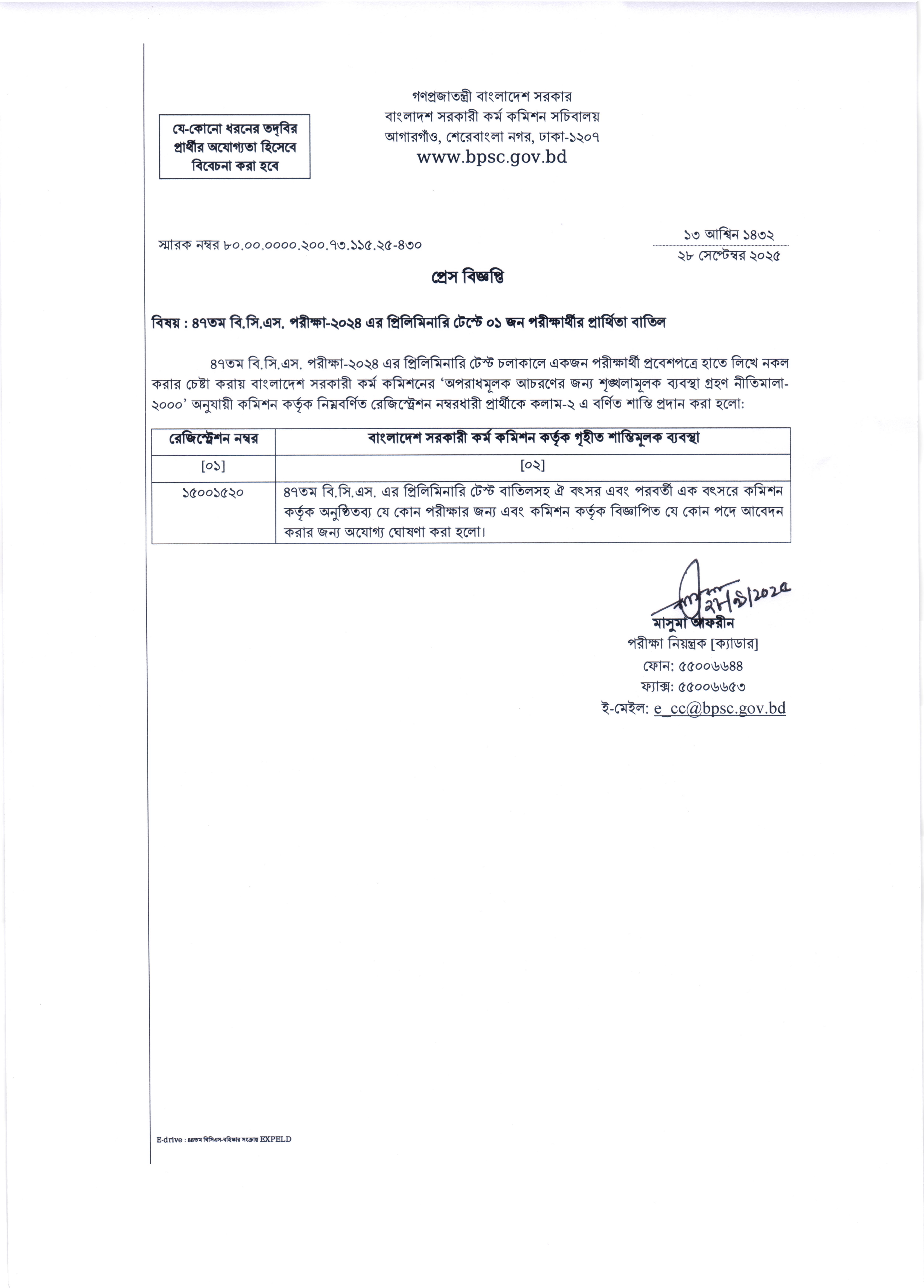 বাংলাদেশ সরকারী কর্ম কমিশন (বিপিএসসি) কর্তৃক ৪৭তম বি.সি.এস. পরীক্ষা-২০২৪ এর প্রিলিমিনারি টেস্টে ০১ জন পরীক্ষার্থীর প্রার্থিতা বাতিল করা হয়েছে।