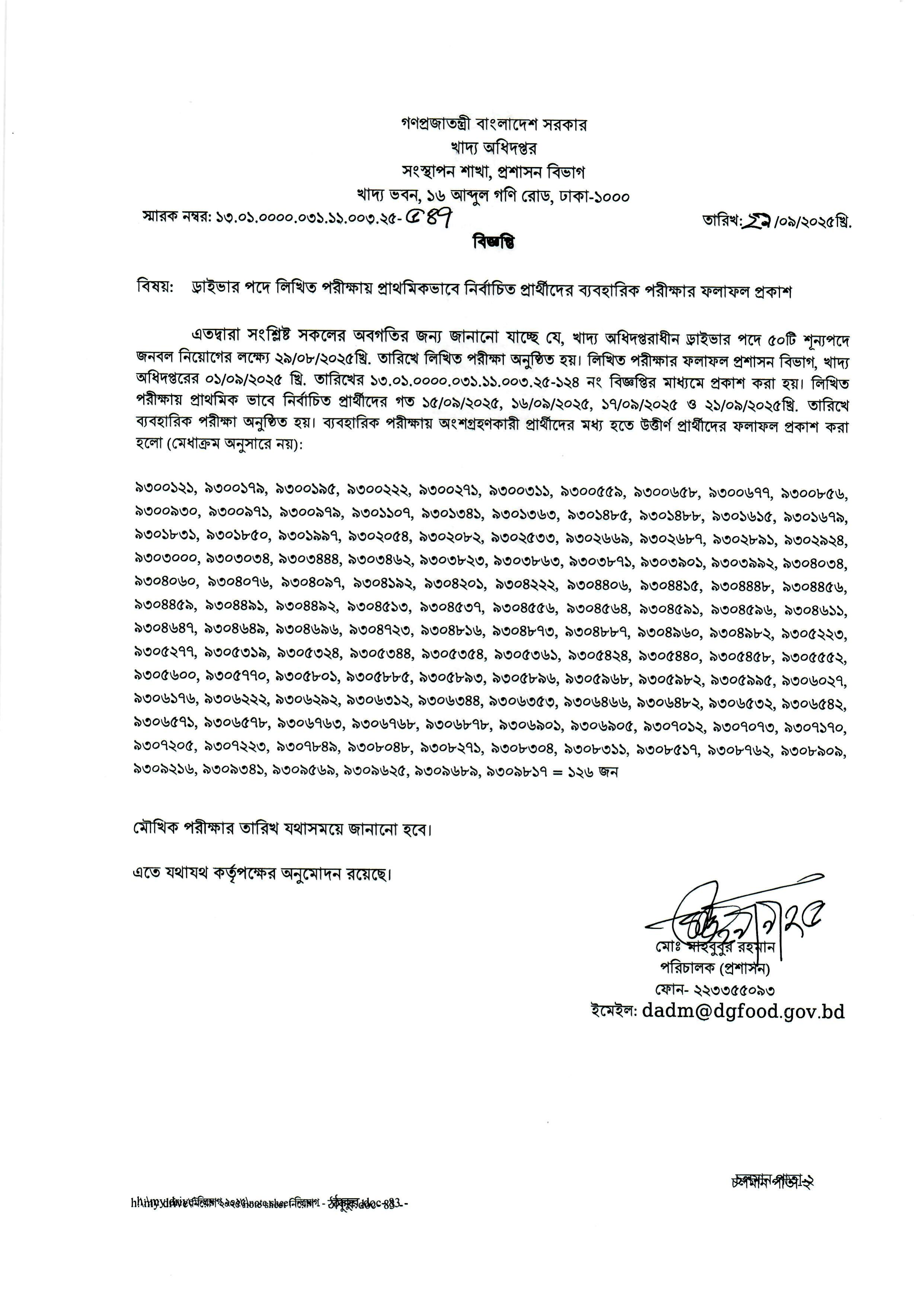 খাদ্য অধিদপ্তরাধীন ড্রাইভার পদে ৫০টি শূন্যপদের বিপরীতে জনবল নিয়োগের লক্ষ্যে অনুষ্ঠিত ব্যবহারিক পরীক্ষার ফলাফল প্রকাশ করা হয়েছে।
