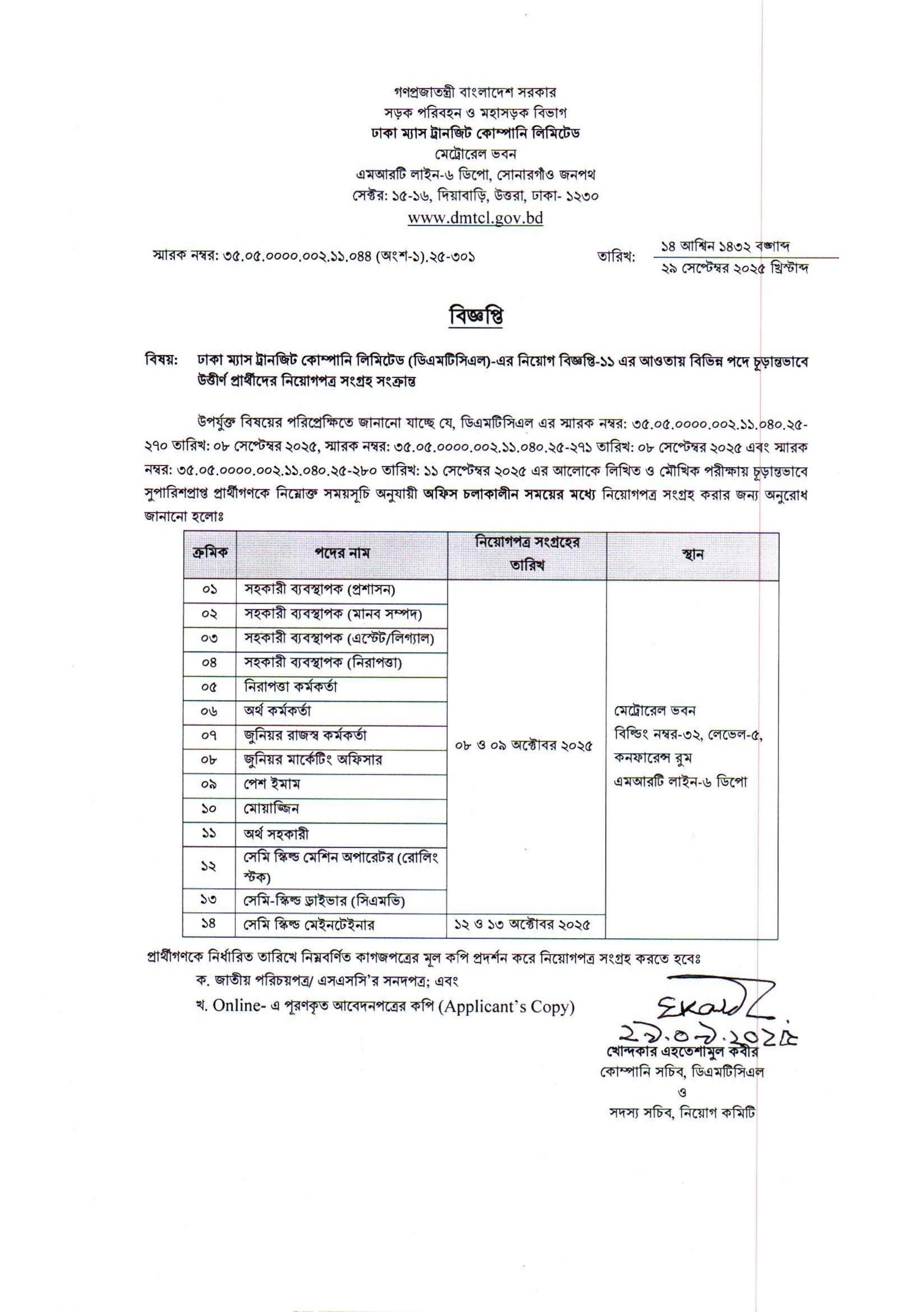 ঢাকা ম্যাস ট্রানজিট কোম্পানি লিমিটেড (ডিএমটিসিএল) এর নিয়োগ বিজ্ঞপ্তি-১১ এর আওতায় বিভিন্ন পদে চূড়ান্তভাবে সুপারিশপ্রাপ্ত প্রার্থীদের নিয়োগপত্র সংগ্রহ সংক্রান্ত একটি বিজ্ঞপ্তি প্রকাশিত হয়েছে।