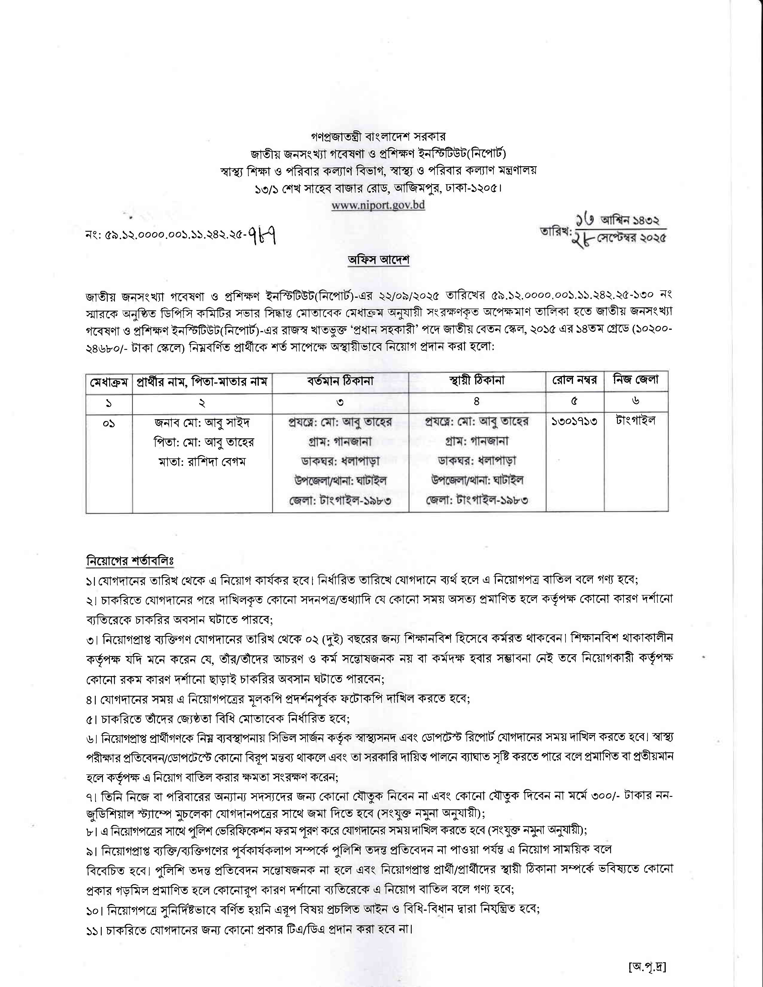 জাতীয় জনসংখ্যা গবেষণা ও প্রশিক্ষণ ইনস্টিটিউট (নিপোর্ট)-এর রাজস্ব খাতভুক্ত 'প্রধান সহকারী' পদে ০১ (এক) জনকে অস্থায়ীভাবে নিয়োগ প্রদান করা হয়েছে।