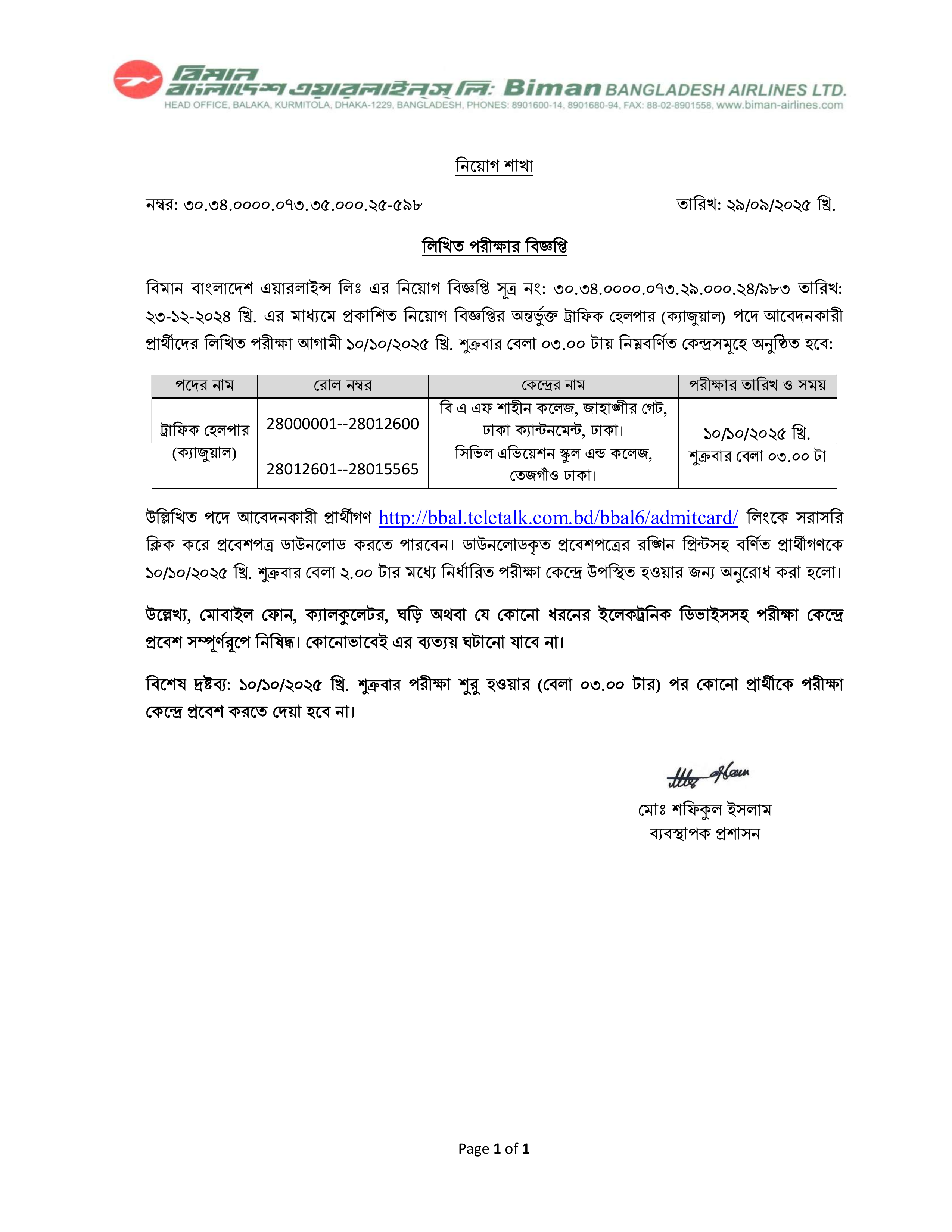বিমান বাংলাদেশ এয়ারলাইন্স লিঃ এর নিয়োগ বিজ্ঞপ্তি সূত্রে প্রকাশিত ট্রাফিক হেলপার (ক্যাজুয়াল) পদের লিখিত পরীক্ষার তারিখ ঘোষণা করা হয়েছে।