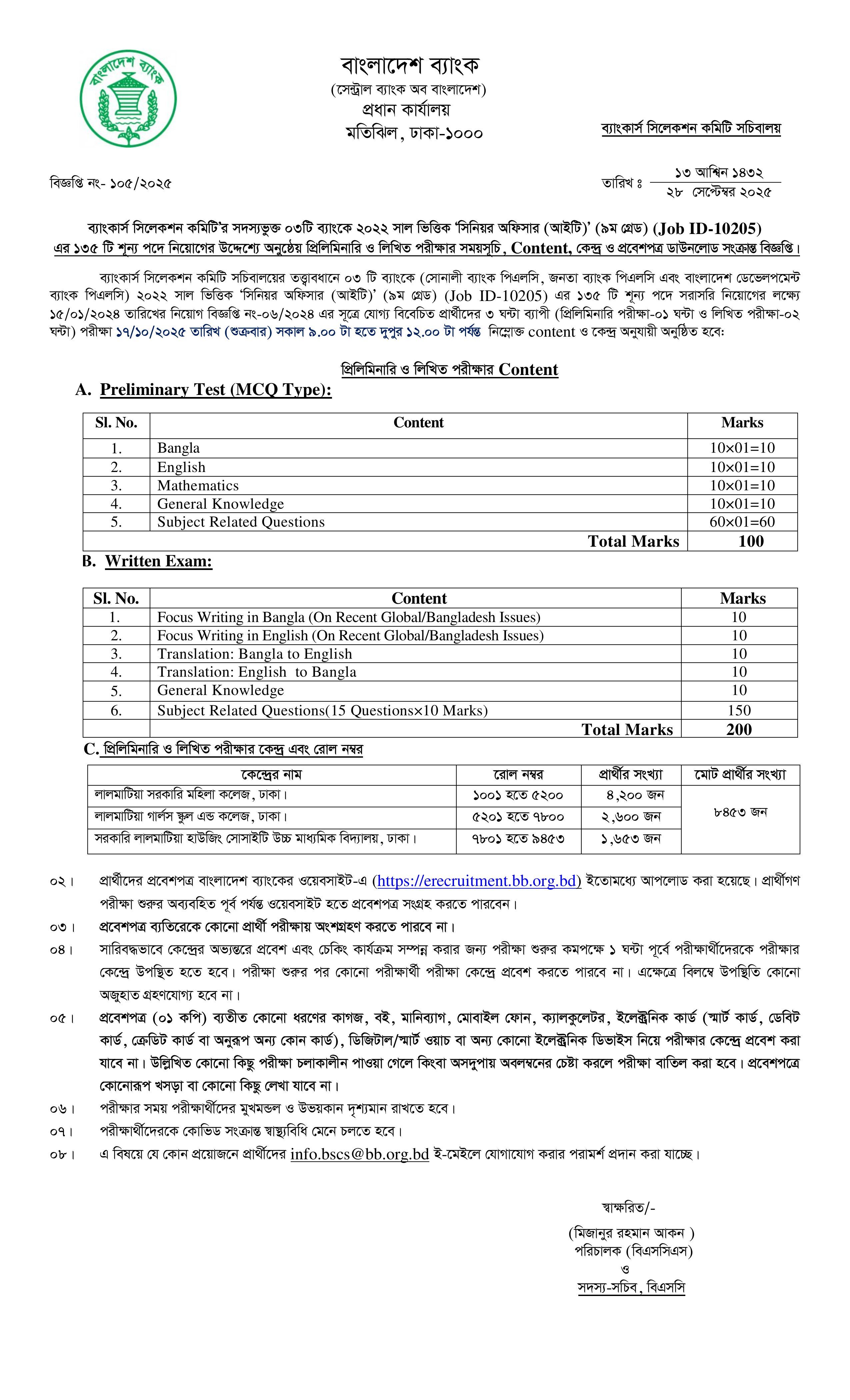 ব্যাংকার্স সিলেকশন কমিটির তত্ত্বাবধানে ০৩টি ব্যাংকে "সিনিয়র অফিসার (আইটি)" (৯ম গ্রেড) এর ১৩৫টি শূন্য পদে নিয়োগের প্রিলিমিনারি ও লিখিত পরীক্ষার সময়সূচি এবং প্রবেশপত্র ডাউনলোড সংক্রান্ত বিজ্ঞপ্তি প্রকাশ করা হয়েছে।