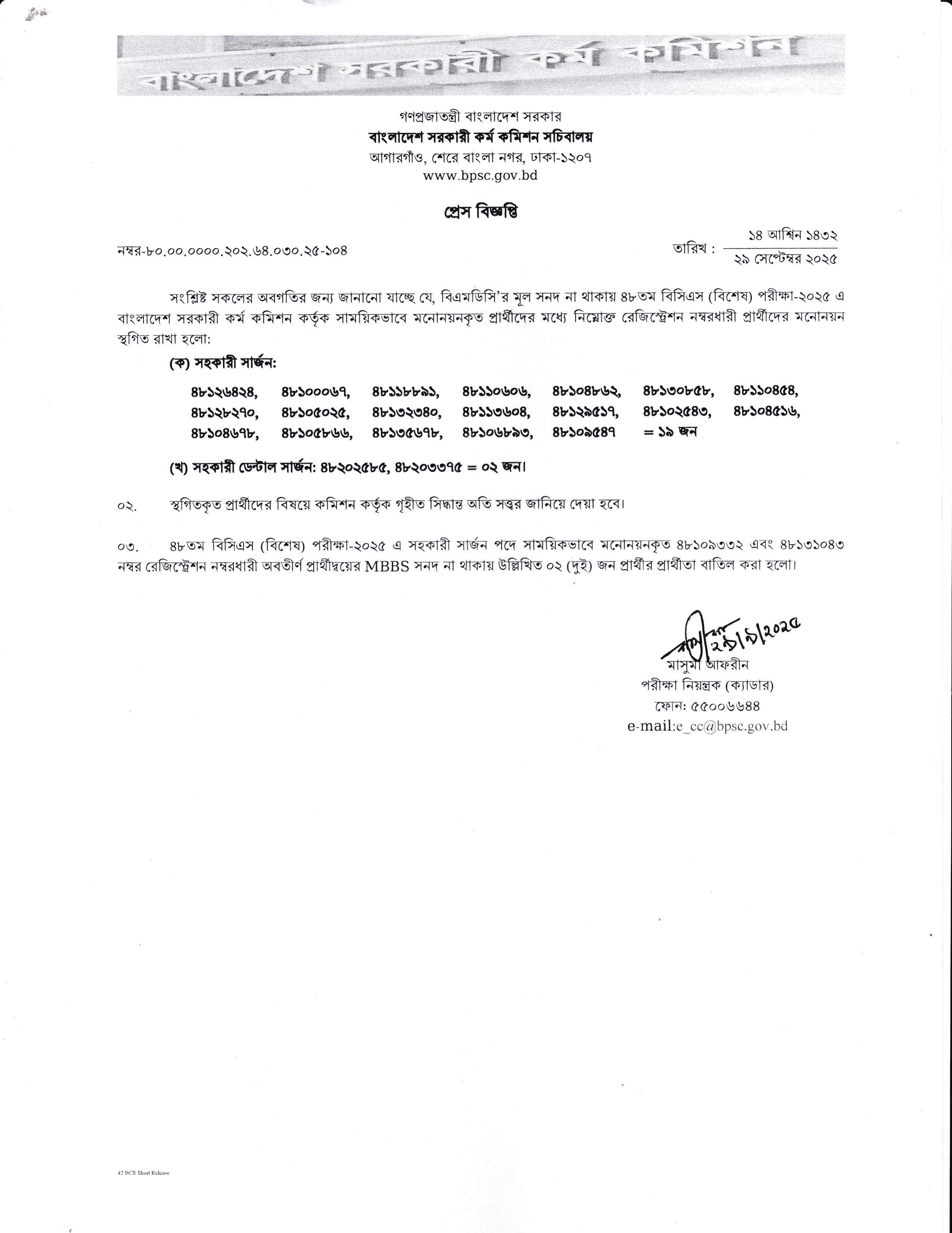 এছাড়াও, ৪৮তম বিসিএস (বিশেষ) পরীক্ষা-২০২৫ এ সহকারী সার্জন পদে সাময়িকভাবে মনোনয়নকৃত ০২ (দুই) জন প্রার্থীর '4883 সনদ' না থাকায় তাদের প্রার্থীতা বাতিল করা হয়েছে।
