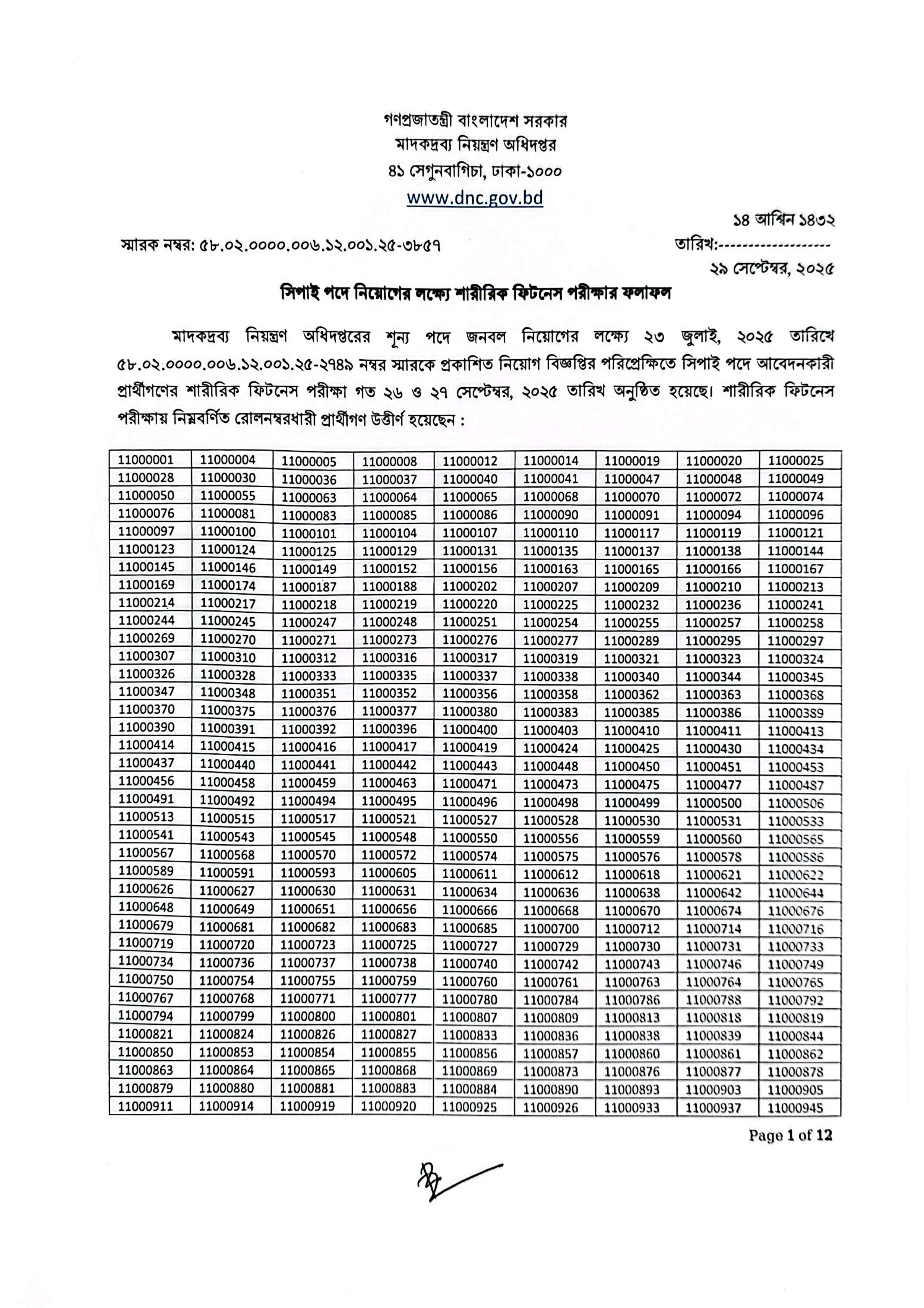 মাদকদ্রব্য নিয়ন্ত্রণ অধিদপ্তরের 'সিপাই' পদে জনবল নিয়োগের লক্ষ্যে অনুষ্ঠিত শারীরিক ফিটনেস পরীক্ষার ফলাফল প্রকাশিত হয়েছে।