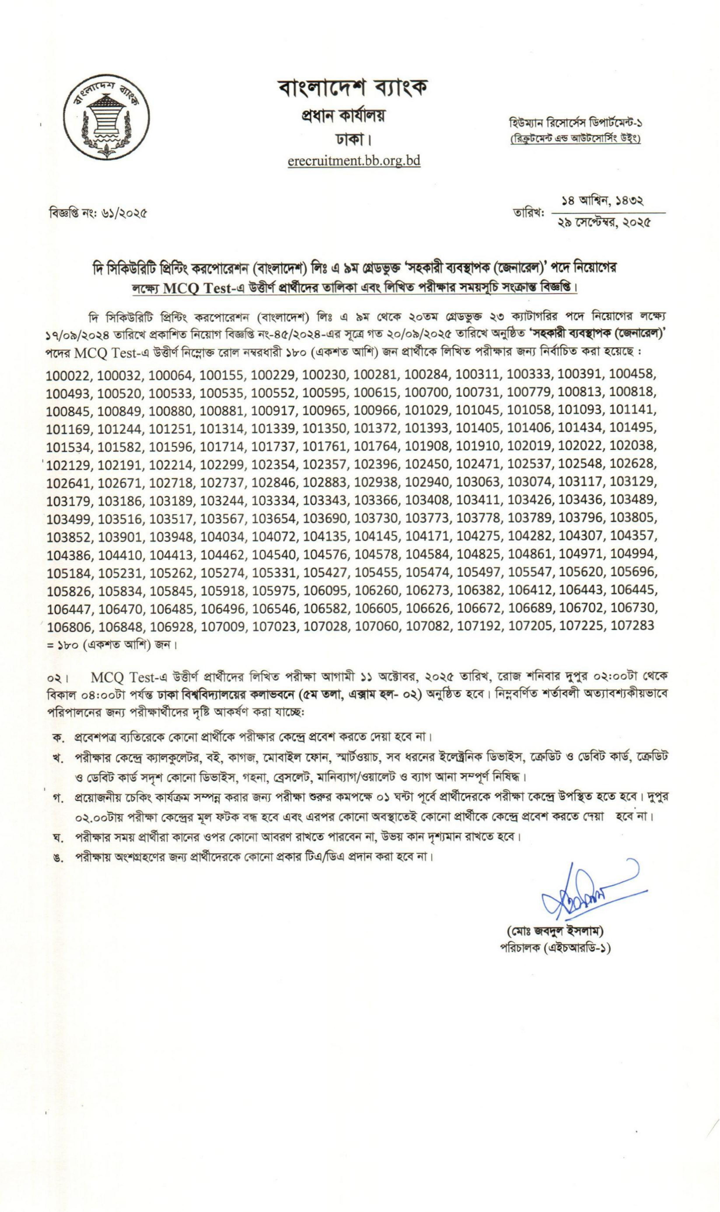 দি সিকিউরিটি প্রিন্টিং করপোরেশন (বাংলাদেশ) লিঃ এর ৯ম গ্রেডভুক্ত সহকারী ব্যবস্থাপক (জেনারেল) পদে নিয়োগের ব্যবহারিক পরীক্ষার ফলাফল প্রকাশ করা হয়েছে। গত ২০/০৯/২০২৫ তারিখে অনুষ্ঠিত ব্যবহারিক পরীক্ষায় ১৮০ (একশত আশি) জন প্রার্থীকে লিখিত পরীক্ষার জন্য নির্বাচিত করা হয়েছে।
