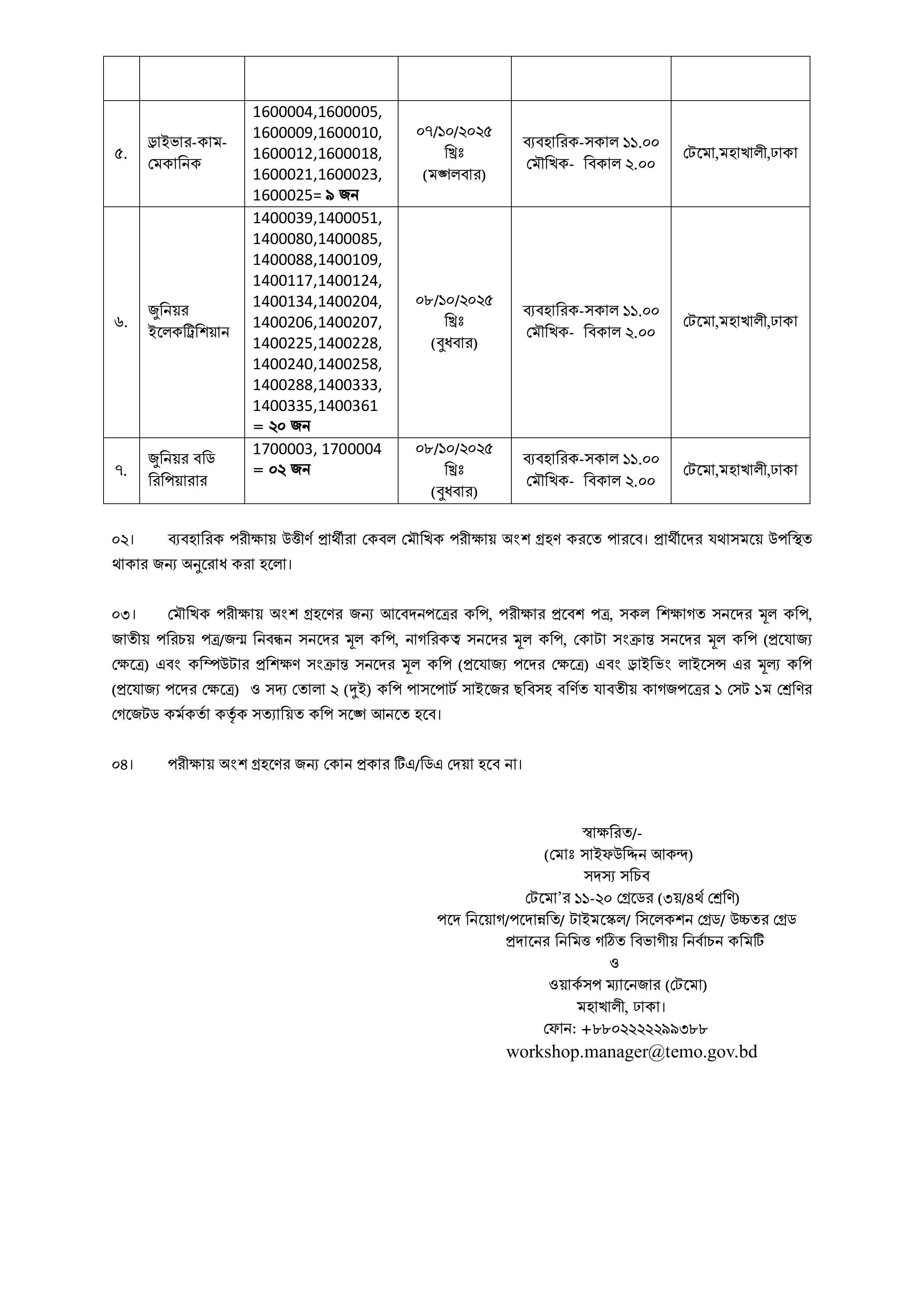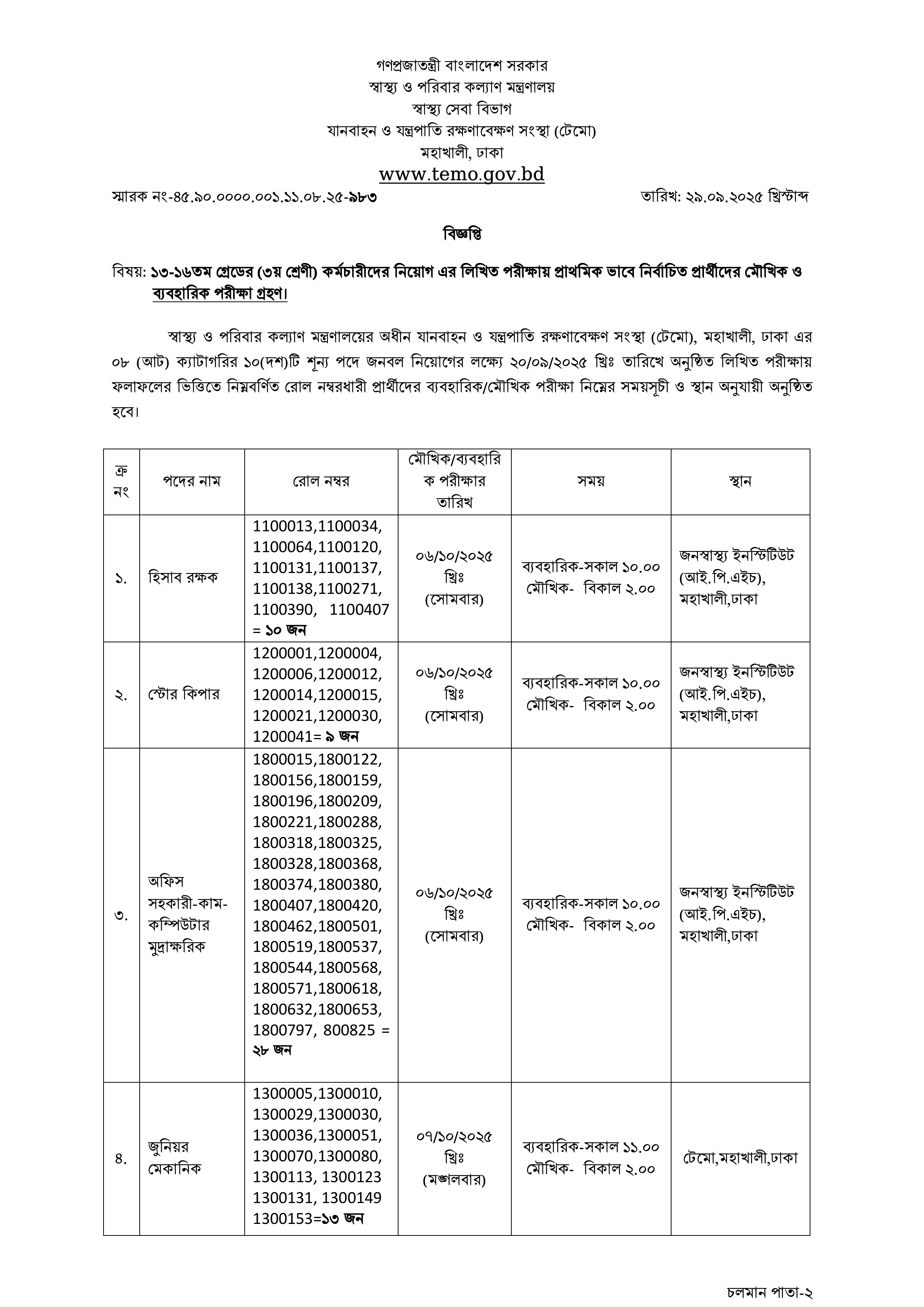 স্বাস্থ্য ও পরিবার কল্যাণ মন্ত্রণালয়ের অধীন যানবাহন ও যন্ত্রপাতি রক্ষণাবেক্ষণ সংস্থা (টেমো), মহাখালী, ঢাকা এর ১৩-১৬তম গ্রেডের (৩য় শ্রেণী) কর্মচারীদের নিয়োগের জন্য অনুষ্ঠিত লিখিত পরীক্ষার ফলাফল এবং মৌখিক ও ব্যবহারিক পরীক্ষার সময়সূচী প্রকাশ করা হয়েছে।